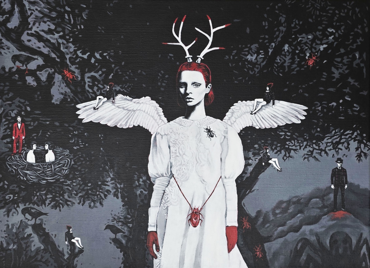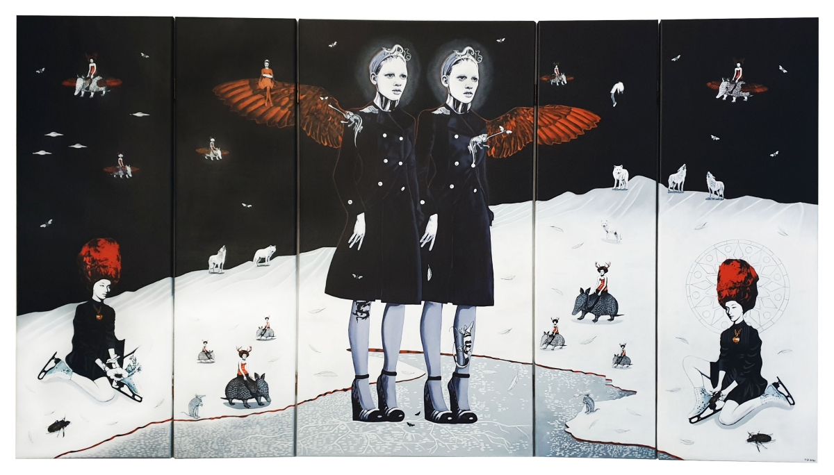 Twins frequently appear in my work, as mirrors, shadows or inseparable entities, symbolizing the tension between the inner self and our relationships with others.