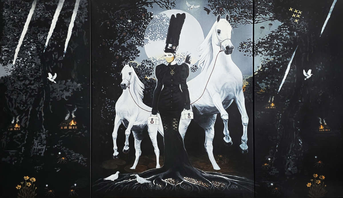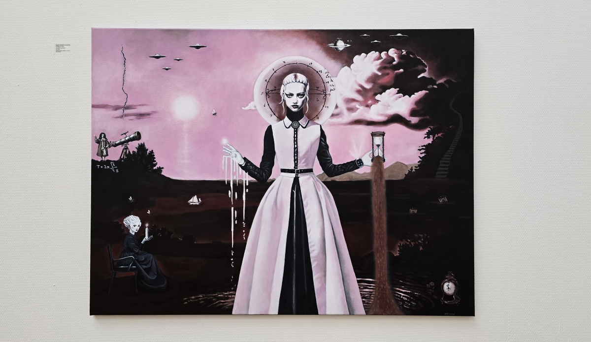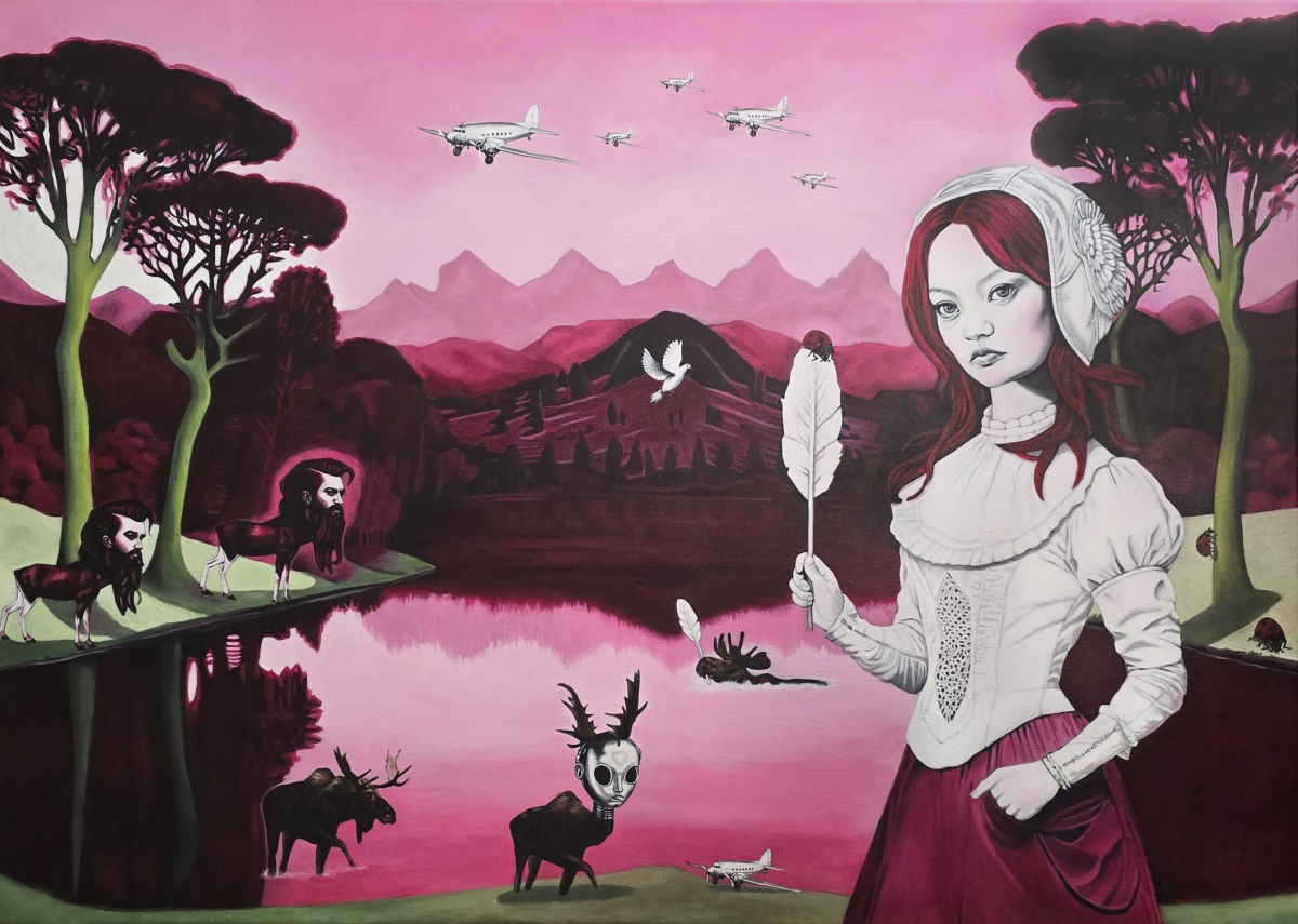 In my hybrid paintings, I explore human relationships and social themes, with a focus on traditional female roles.