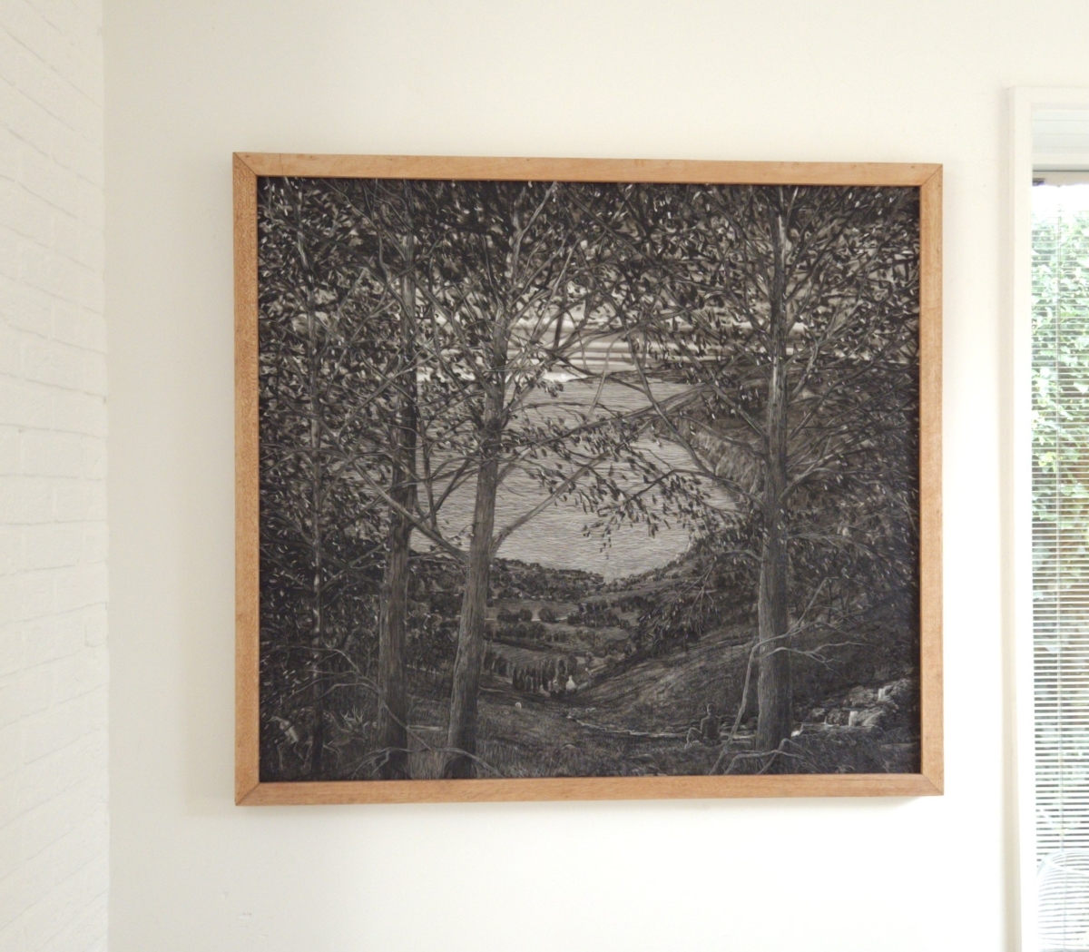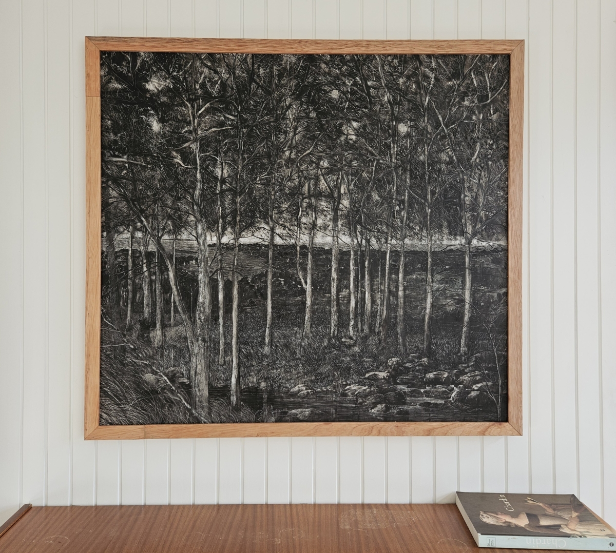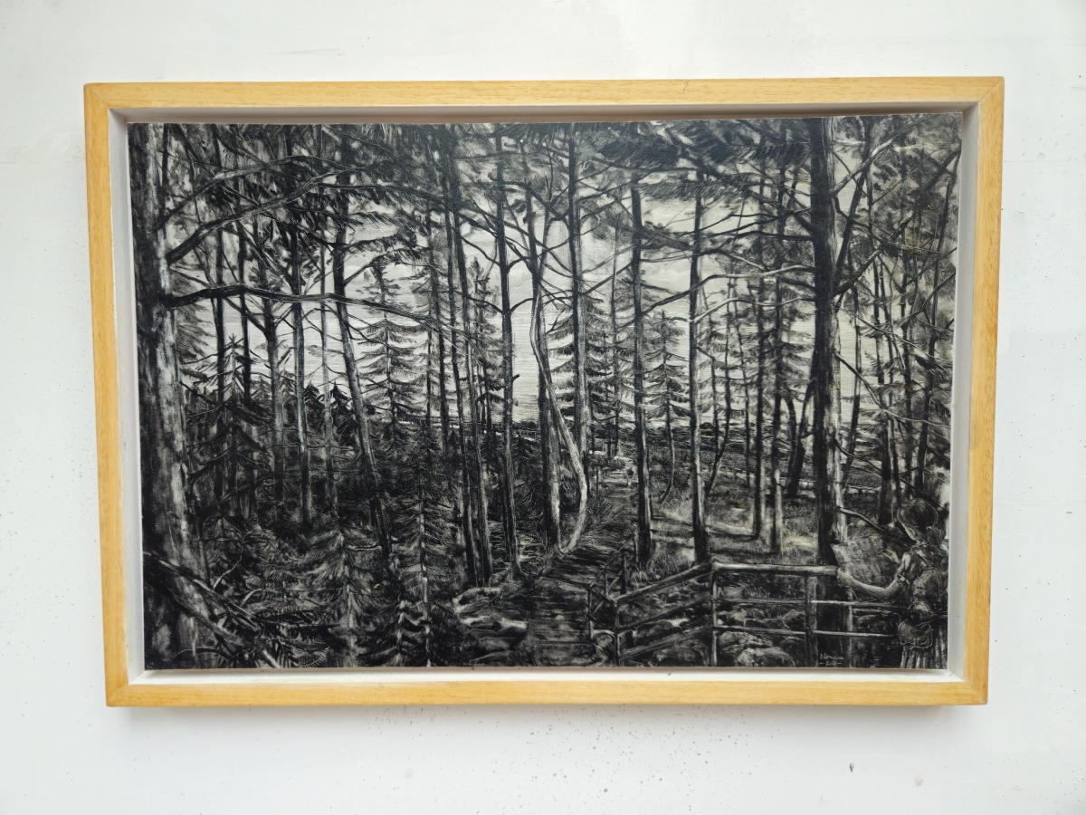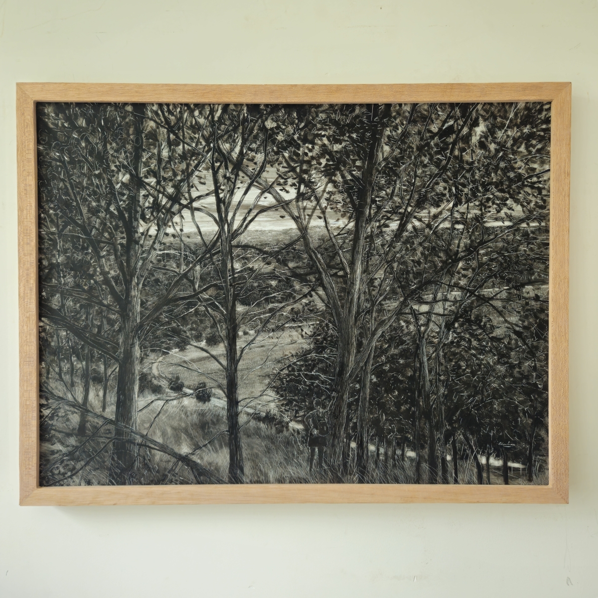 island, walkers, stream and bird, 2025 | 101 xx 122 cm oil on panel in artist's frame