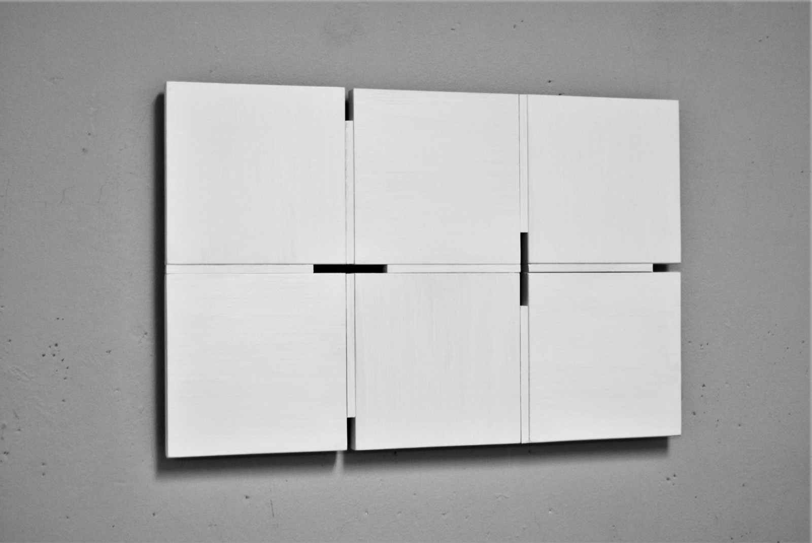 Soms is een minimale verschuiving al genoeg om een interessant beeld op te leveren. Bij dit specifieke werk gebeurt dat door het creëren van een horizontale en een verticale ruimte. De 6 vlakken en 7 lijnstukken zijn samen gevoegd door een constructie aan de achterzijde Het exacte formaat is 30.8cm hoog x 46,6 cm breed .
