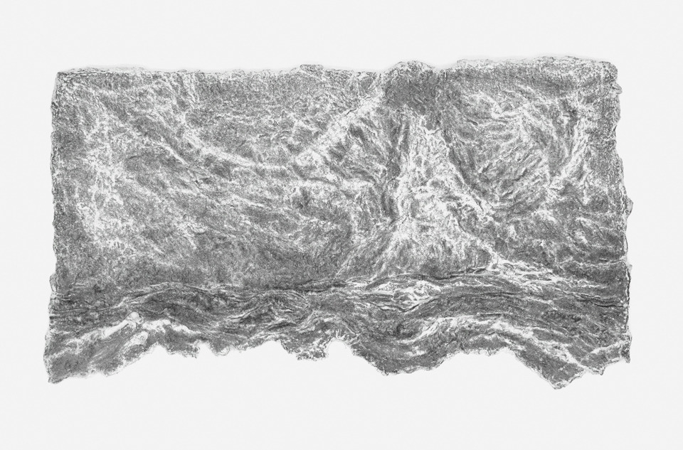 Getekend met mechanisch vulpotlood op zelf geschept papier. Tekening is opgeplakt op foam karton waardoor het zweeft boven het grijze passepartout karton. De tekening is verdiept ingelijst door 1cm dikke latjes, die net als de lijst grijs geschilderd zijn. Ingelijst met ontspiegeld glas.