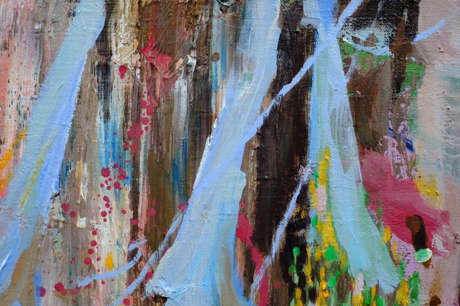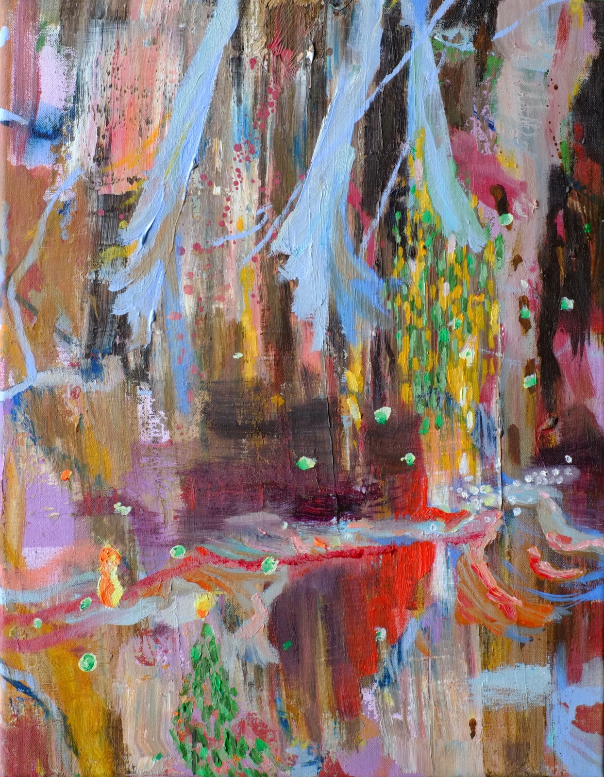 De ingang van een donkerder bos. een brug leid je eer naar toe. Onder je kan warm vuur zijn, het klimt tegen de boom op. Er hangen blauw transparante vleugels boven het pad. Ze begeleiden je het bos in. Misschien zijn het engelvleugels.. De reis wordt warm en koud, spannend en vrolijk.