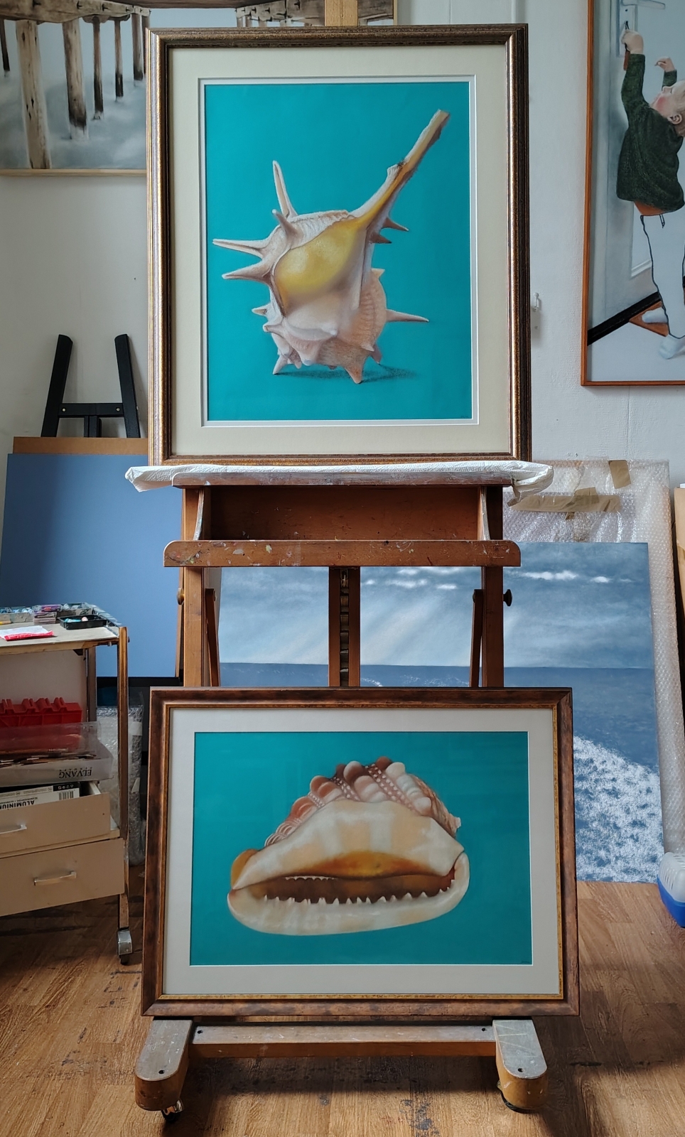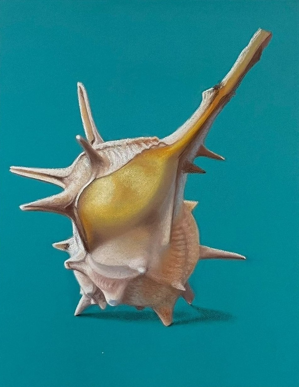 Schilderij van een schelp uit de serie Mer du Sud, ingelijst met dubbel passe-partout.