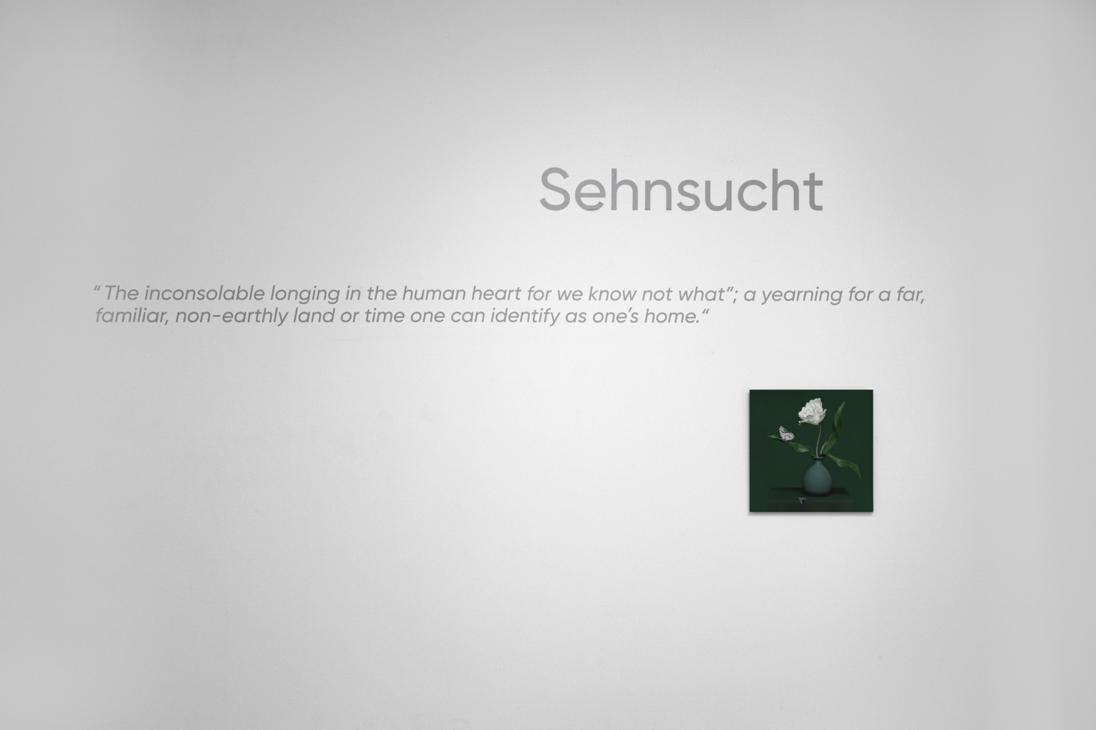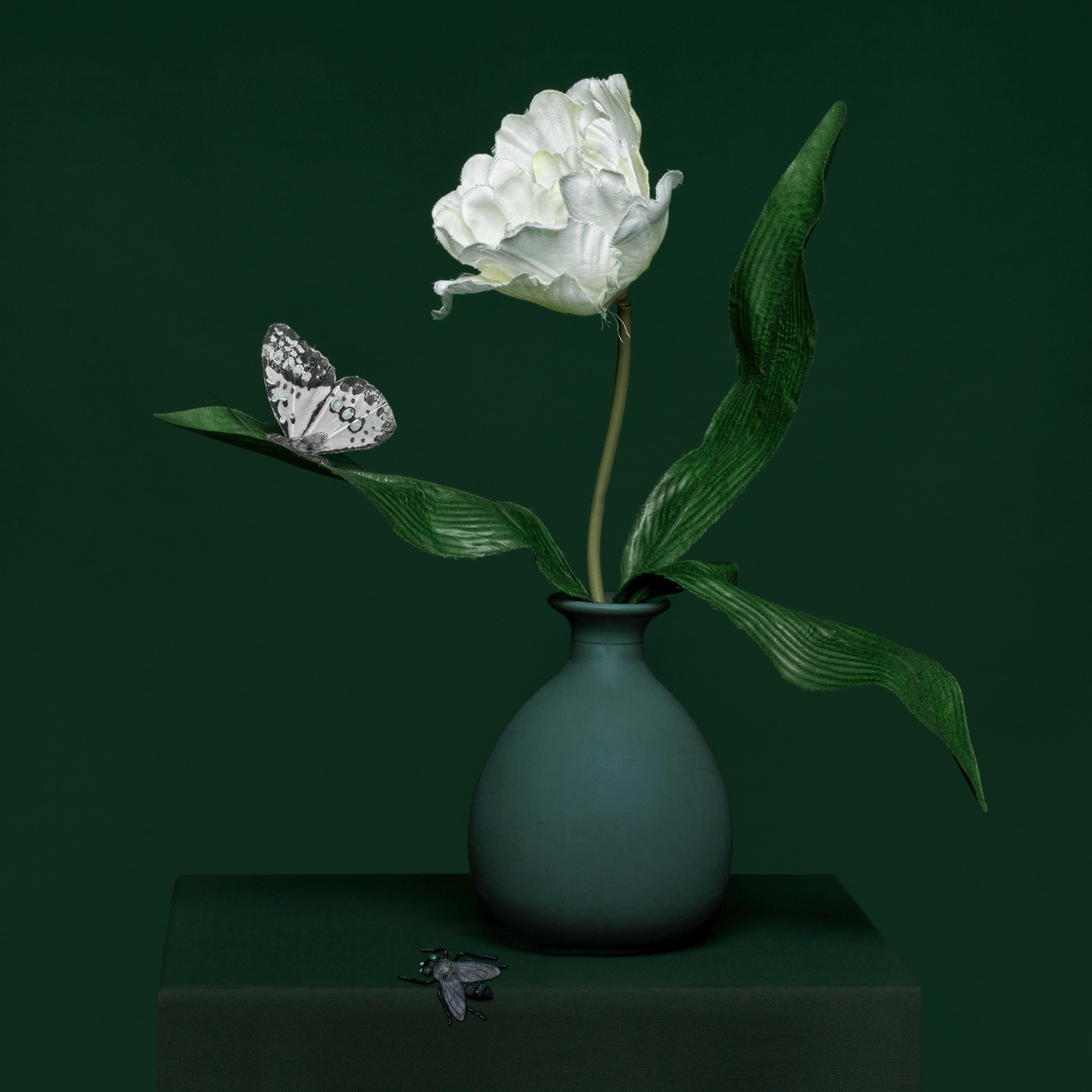 Voor dit bloemstilleven, getiteld Tulip in a Vase with Butterfly liet ik me inspireren door een schilderij van de hand van Balthasar van der Ast, dat hij maakte omstreeks 1625. Het sprak me aan vanwege de doeltreffende eenvoud. Een vaasje met één zwierige tulp. In het tafereel figureren een vlinder en een vlieg: de vlinder als metafoor voor transformatie en wedergeboorte, soms ook voor de ziel die het lichaam verlaat; de vlieg als teken van verval en de onvermijdelijkheid van de dood. Samen verbeelden zij de kwetsbare grens tussen leven en dood, tussen het spirituele en het aardse – een terugkerend thema in Hollandse stillevens uit de 17de eeuw.
