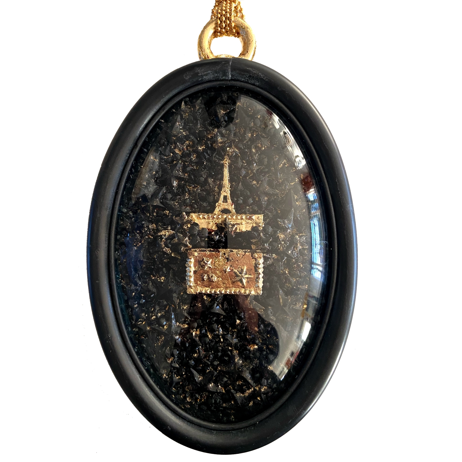 L Medallion ‘Starry starry night’. Met vele sterren aan de donkere nacht die schijnen in Parijs. De Eiffeltoren als teken van deze stad. De mystieke doos van een goochelaar die openstaat en waar de sterren uit lijken te komen. Een verwijzing naar de ‘the Starry Night’ die van Gogh in Parijs schilderde.
