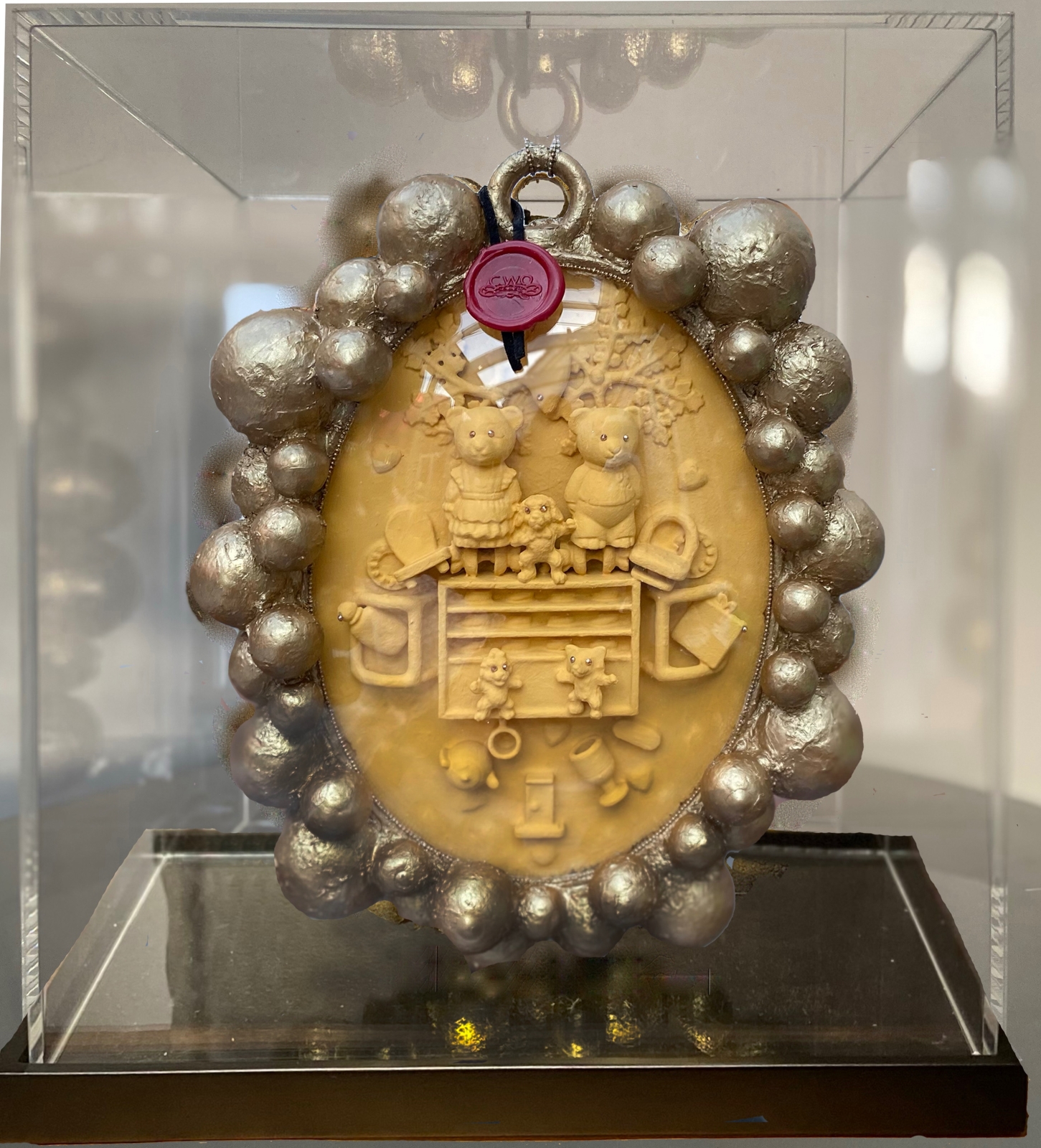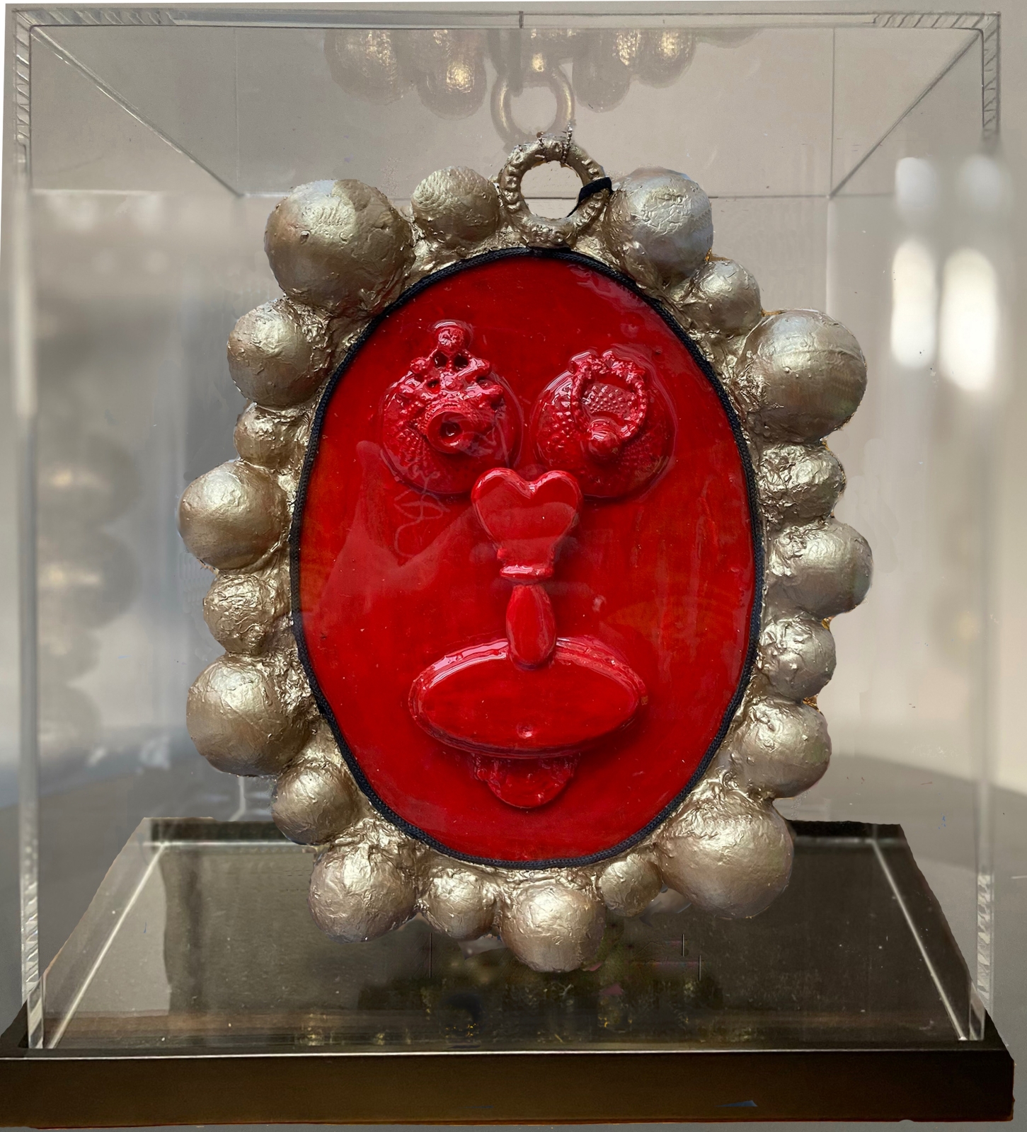 De achterkant heeft een gezicht in het rood. Een groot hart als neus, en de ogen knipogen naar je en er wordt een lolletje gemaakt. Humor is een belangrijk element in het bestaan.
