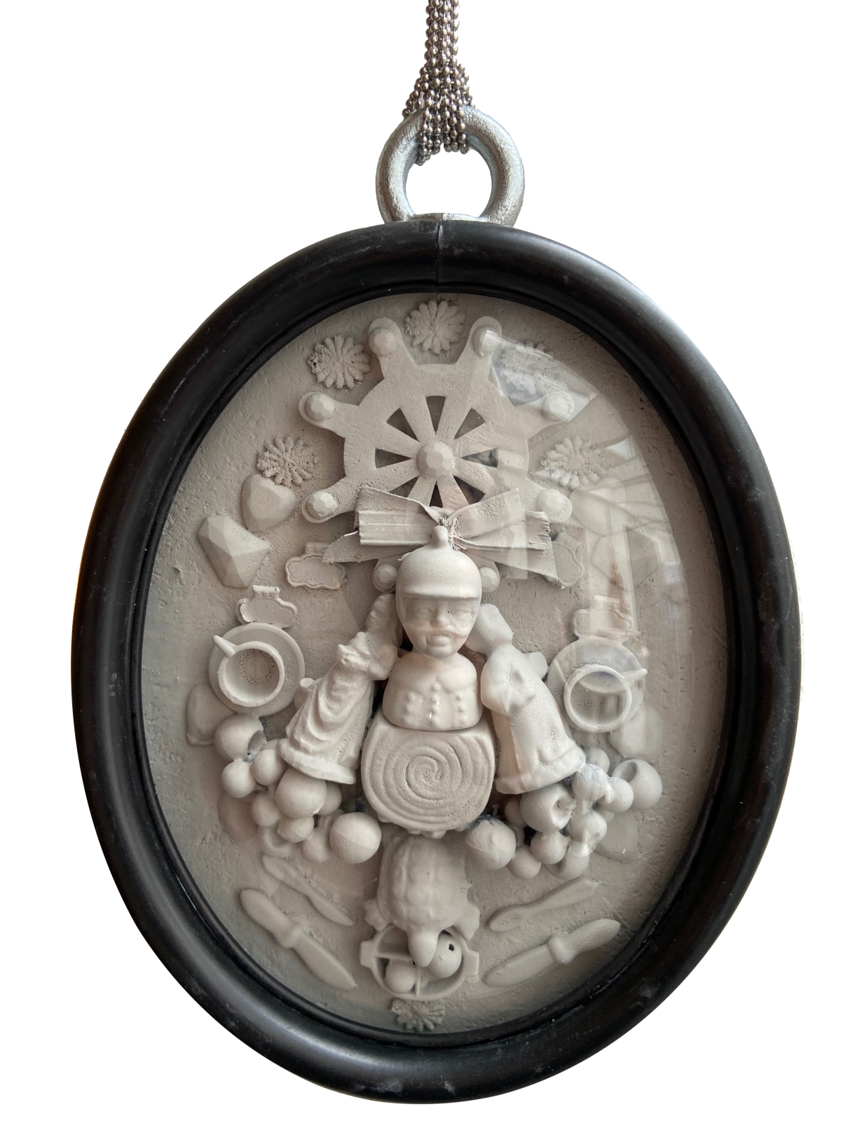 Een uniek 3D verhaal achter half bol glas. Dit medaillon heeft een rubberen frame, metalen ophang ring en balletjes ketting.