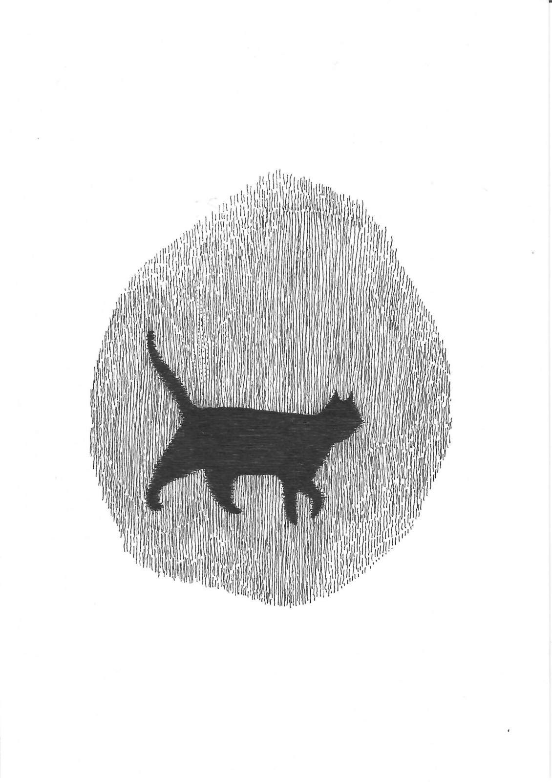 Inspired by Ai Hashimoto’s story Metamorphosis, this drawing captures the moment of passage: the cat stepping into the liminal space between presence and absence. Its silhouette emerges against a field of fine ink lines, evoking both enclosure and expansion. Suspended in transition, the cat becomes a symbol of quiet transformation, embodying the mystery of existence in flux.