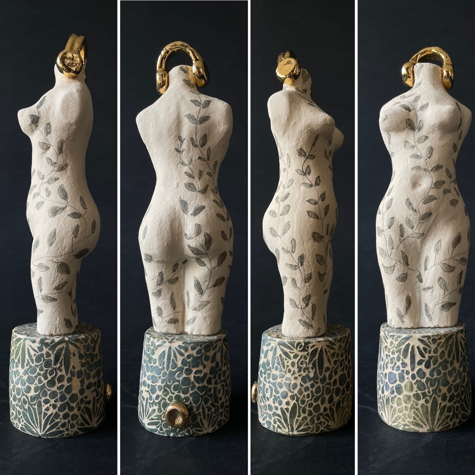 Dit beeld is handmatig opgebouwd uit aardewerk klei. Het is bewerkt met egoben, glazuur en goudluster.