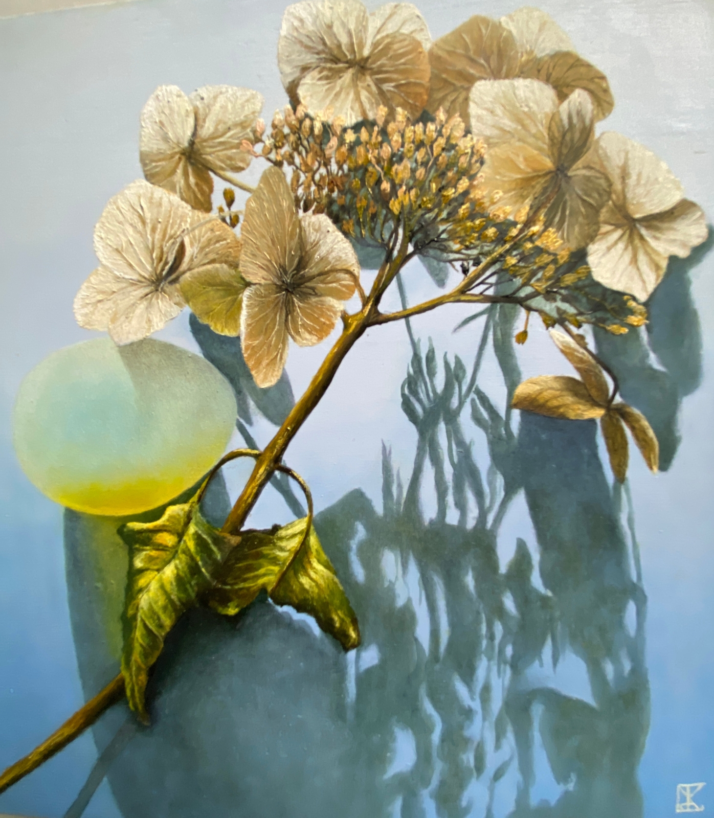 Glazen ei met gedroogde hortensia. Geschildert op bamboeblok van 20x20cm