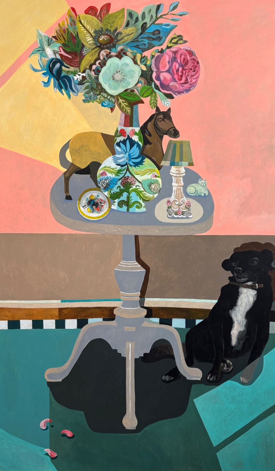 Hondje kaatje onder de tafel. Aluminium frame met linnen.