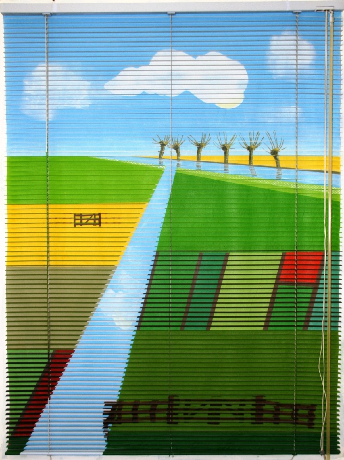 Uit de Serie Hollands Landschap de Polder. Gelaagd werk op een voor en achterdrager die met elkaar een wisselwerking in vorm en kleur aangaan bij het bewegen van de draaistang. Hierdoor ontstaan nieuwe beelden en dus nieuwe versies van eenzelfde beeld. Een afwisselend Landschap..