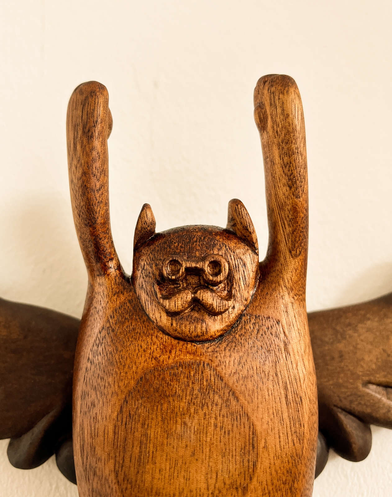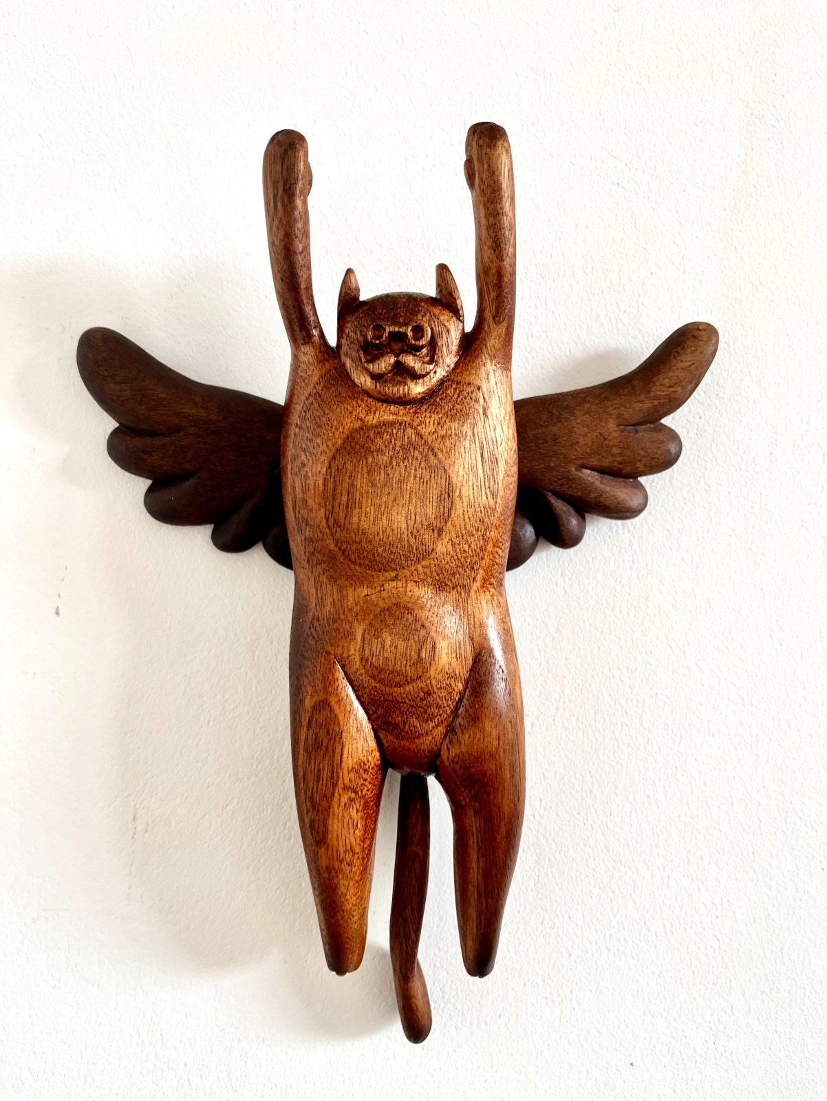 In the story called “Metamorphosis” by Hashimoto, a mysterious cat lives in a perpetual liminal state̶like Schrödinger’s cat̶its true action or condition unknown. Caught mid- flight, this sculpture captures that same suspended mystery, inviting endless interpretation.