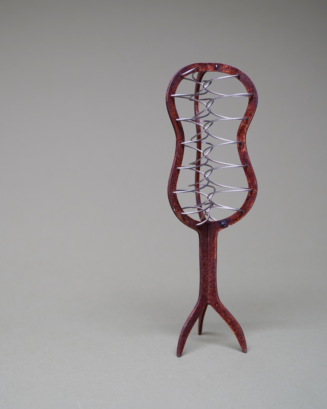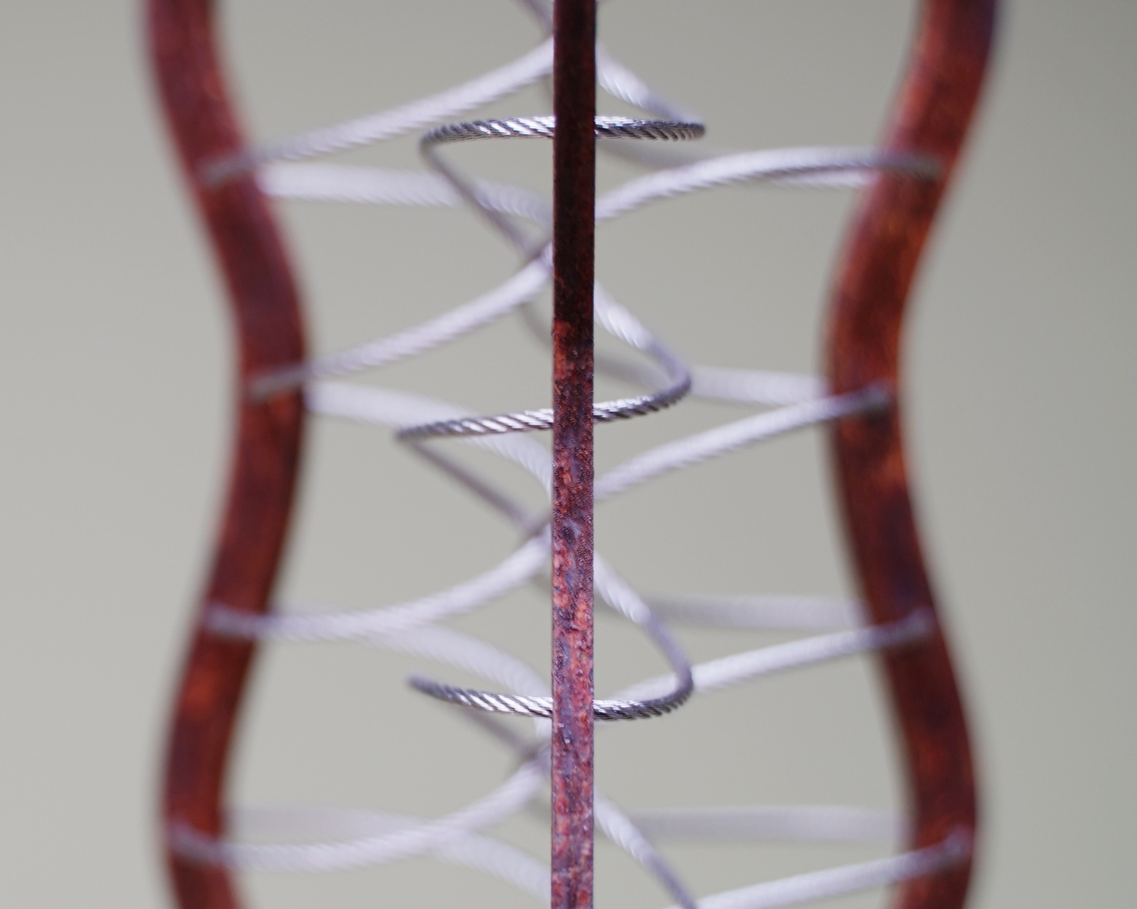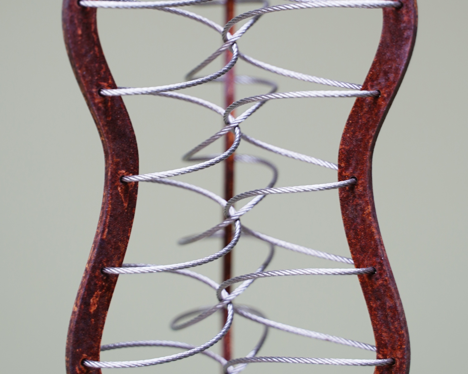 Elke boom groeit uit dezelfde basis, maar ontwikkelt een eigen huid, structuur en karakter — cortenstaal met fijn RVS-draad, speelse kralen en soms ruwe lasnaden.