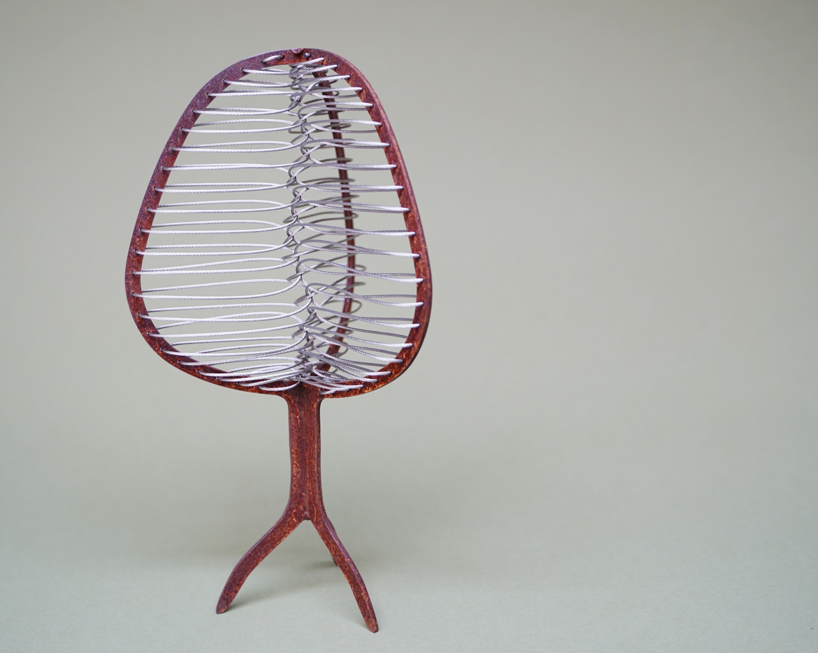 Elke boom groeit uit dezelfde basis, maar ontwikkelt een eigen huid, structuur en karakter — cortenstaal met fijn RVS-draad, speelse kralen en soms ruwe lasnaden.
