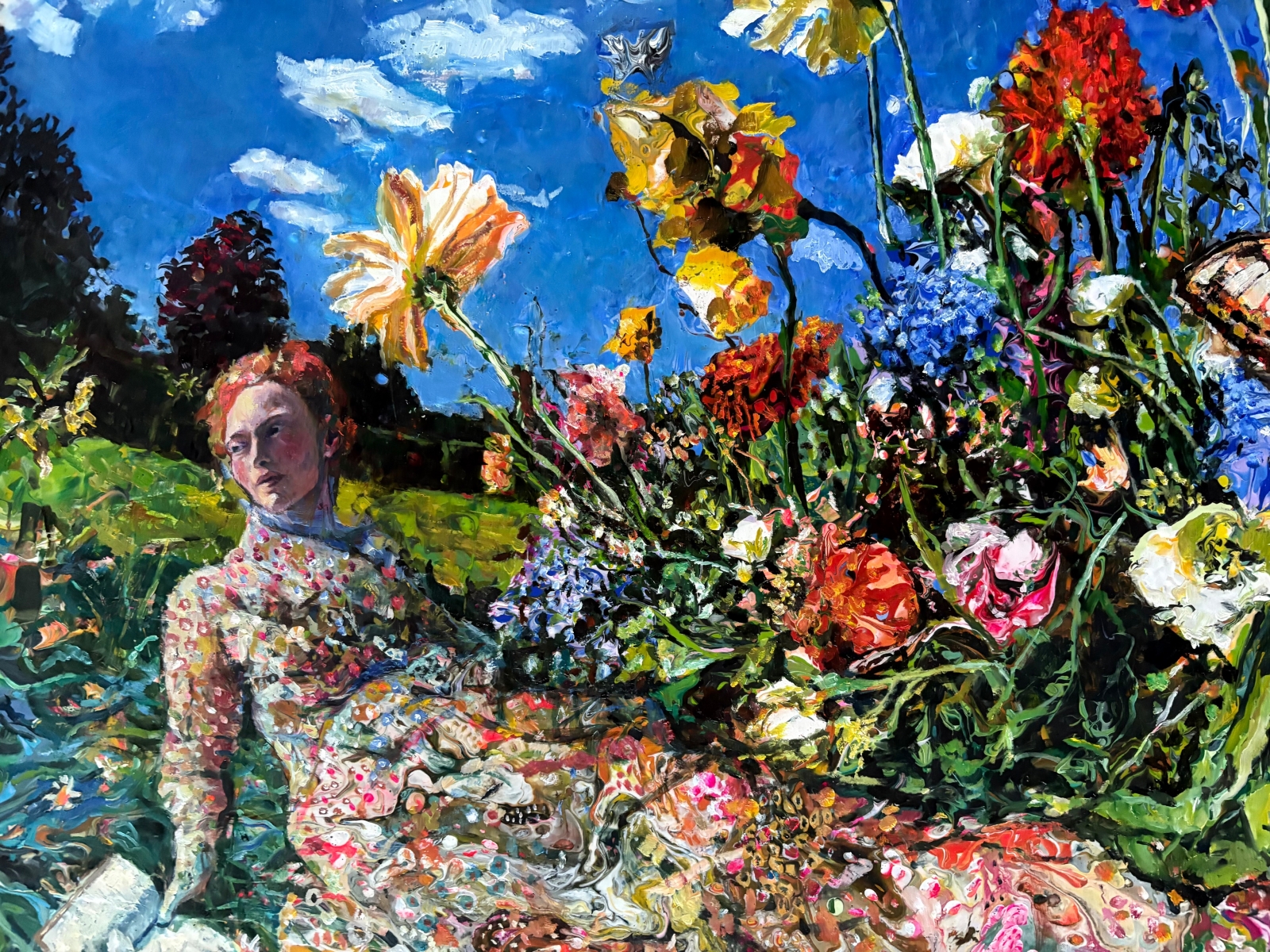 Lezende Helene toont een vrouw die zich, midden in een explosie van kleur en bloemen, overgeeft aan een moment van verstilling. Het werk verbeeldt het thema van de vrouw die alles in zichzelf draagt om volledig gelukkig te zijn — juist door tijd voor zichzelf te nemen. De rijke lagen van olieverf over gegoten acrylverf creëren een levendige, bijna betoverende wereld waarin innerlijke rust en eigen kracht centraal staan. Komt met een stijlvolle smalle zwarte lijst.