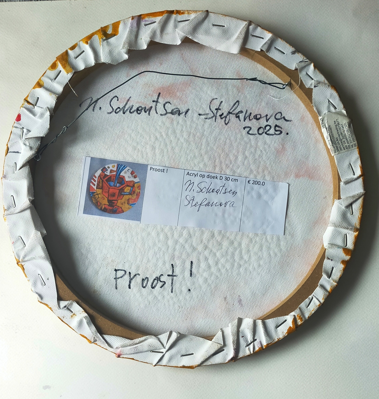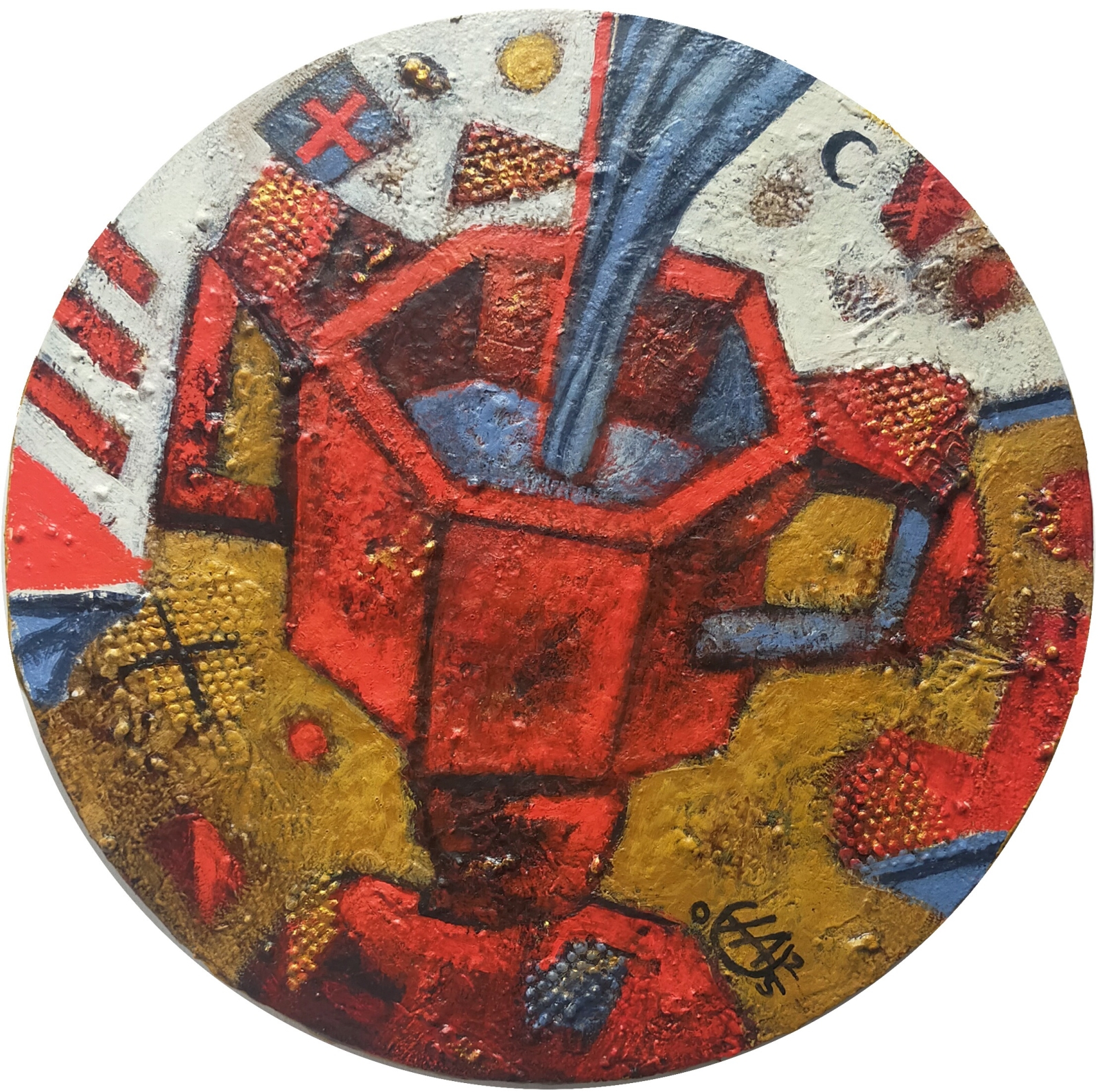 Ronde acryl schilderij met ruw reliëf.