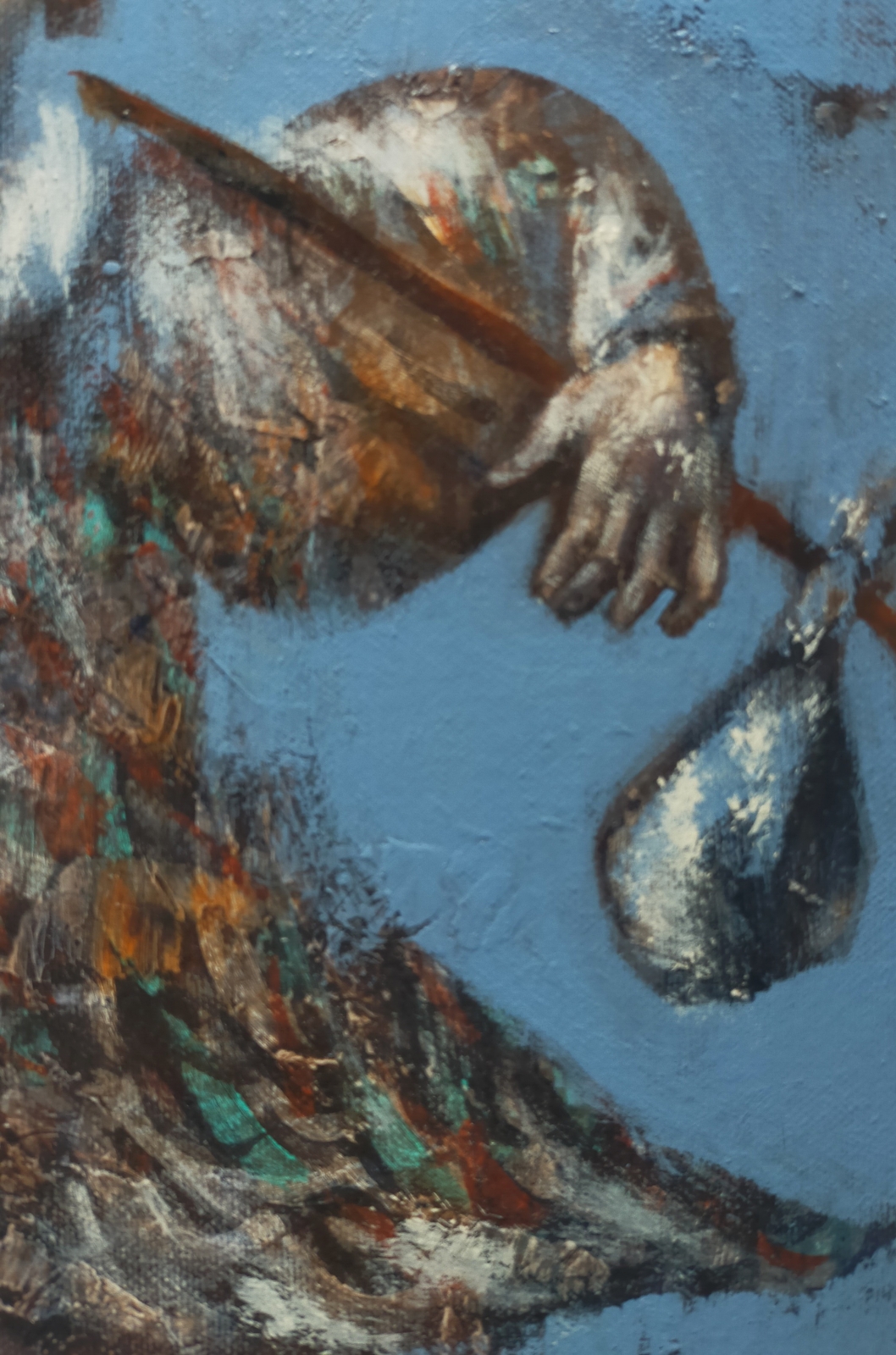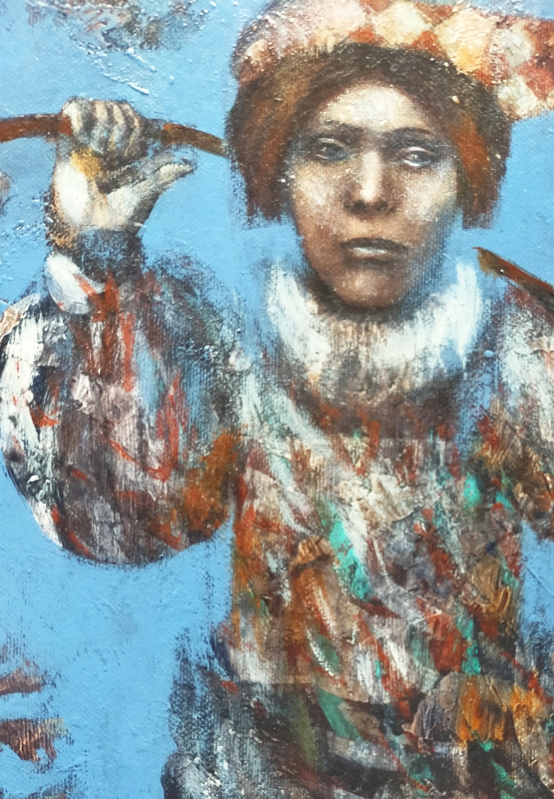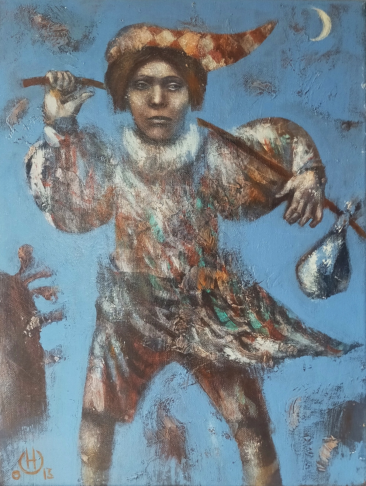 De schilderij is geïnspireerd door de schilderij van Jeroen Bosch waar de men is opgebeld als de landloper op zoek naar zijn weg in leven en zijn leven ervaring. Ook vergelijkbaar met De Dwaas van de Tarot kart O van Grote Arcana. Ingelijst in zwarte lijst.