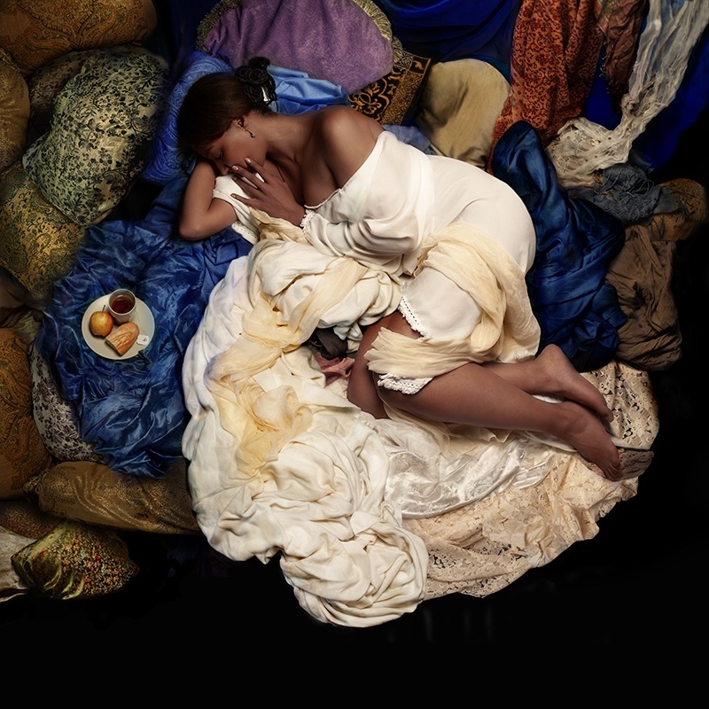Blue is a color that, in the Baroque, conveys calm. Together with gold, it enhances the sense of the divine. The woman is resting and having breakfast, the image has a calm and serene atmosphere.