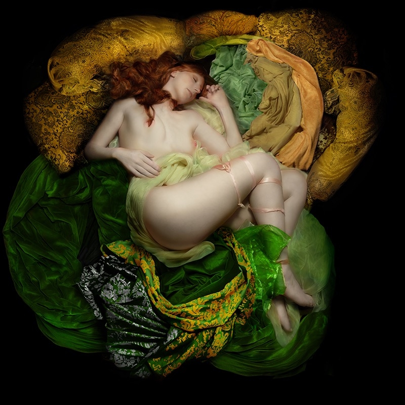 Green is a color that, in the Baroque, conveys nature, hope, love and desire. Together with gold, it enhances the sense of the divine. The goddess of love and sensuality is lying in this image being beautiful in harmony.