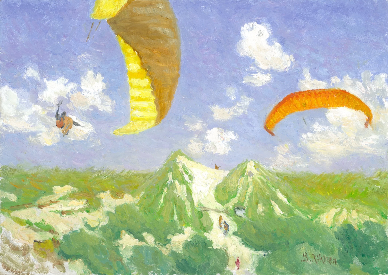 Bij een gunstige thermiek kunnen deze vliegers uren boven een duintop blijven hangen, lekker zittend in hun tuigje...