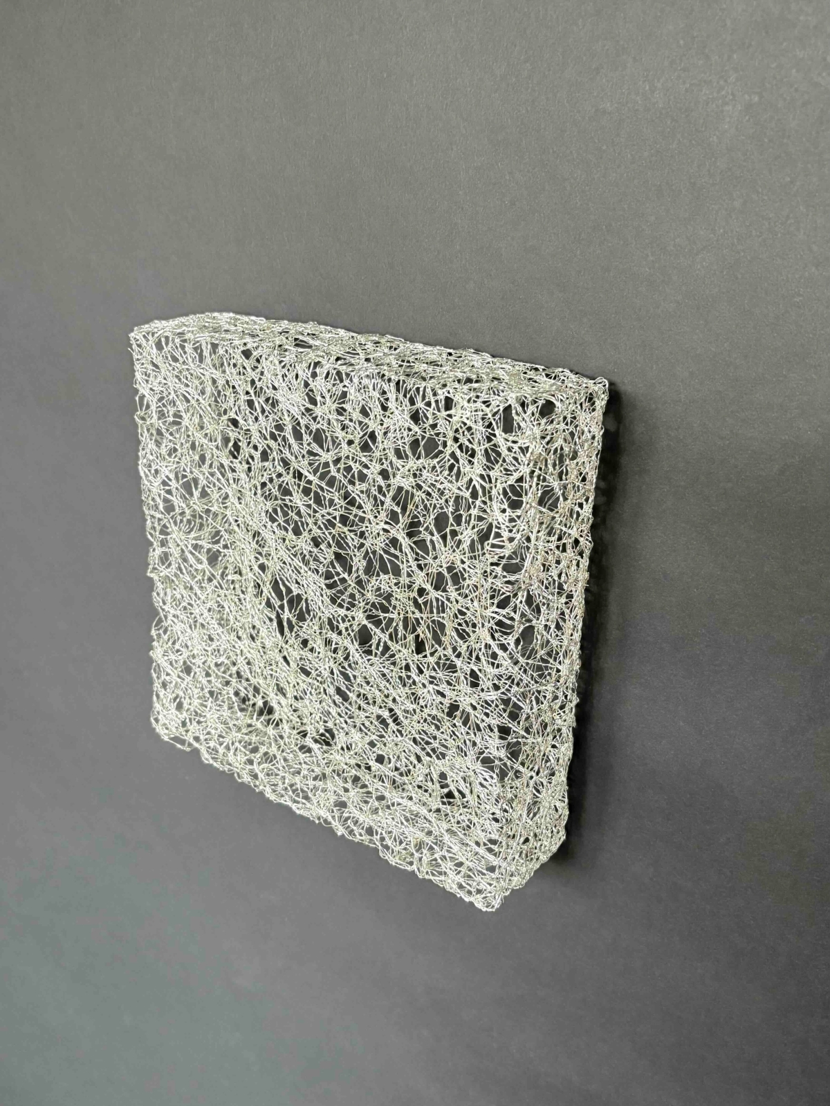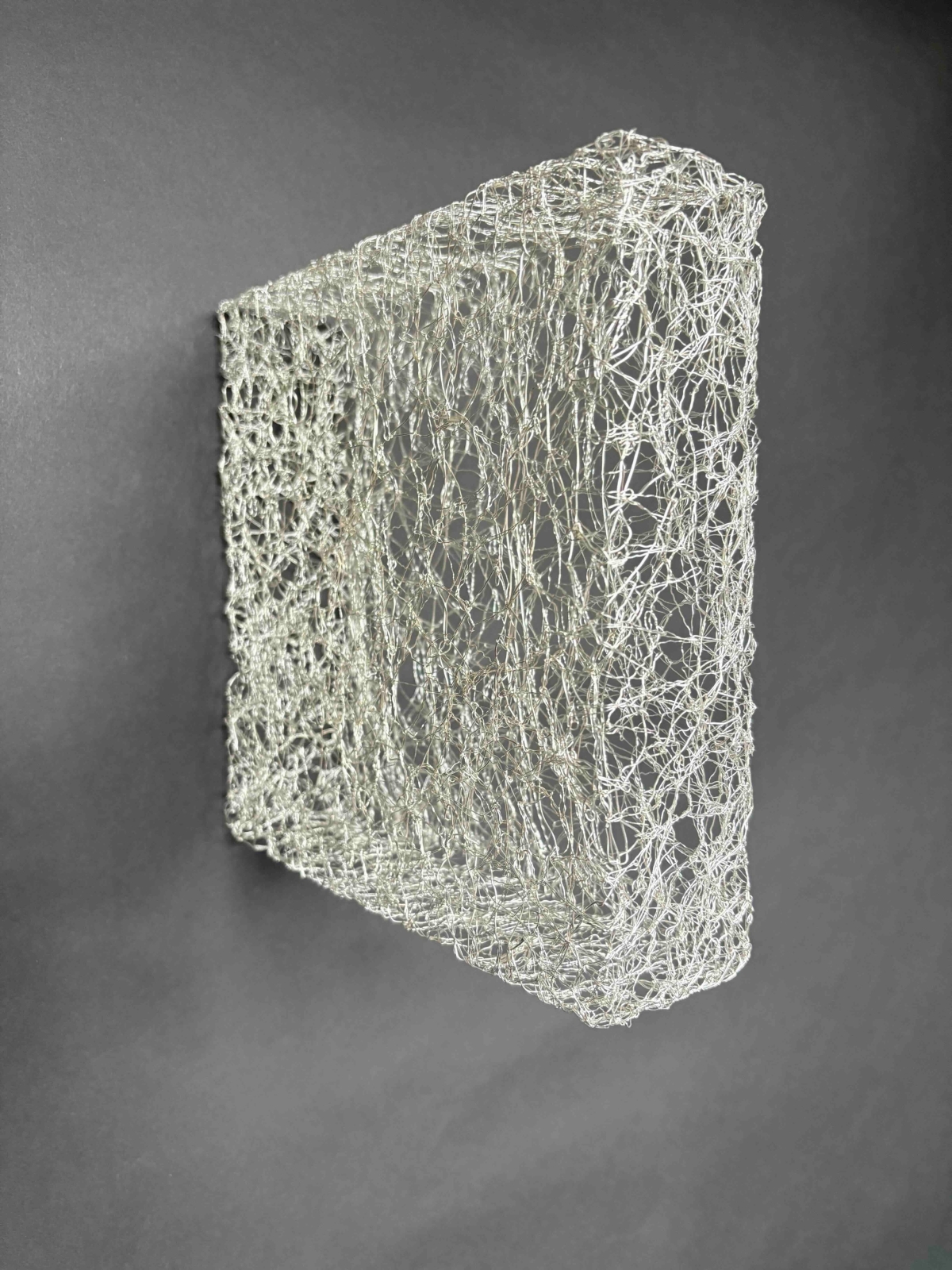 Het sculptuur is een ruimte omwikkeld door metaaldraad.
