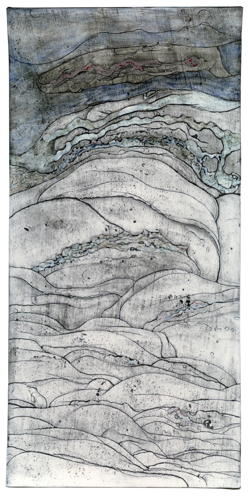 landschap van gegoten porselein, pigment en gedeeltelijk geglazuurd, op hout gemonteerd.