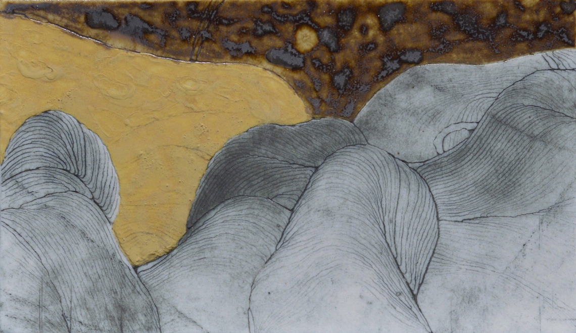 landschap van gegoten porselein, pigment en oxide, gemonteerd op hout.