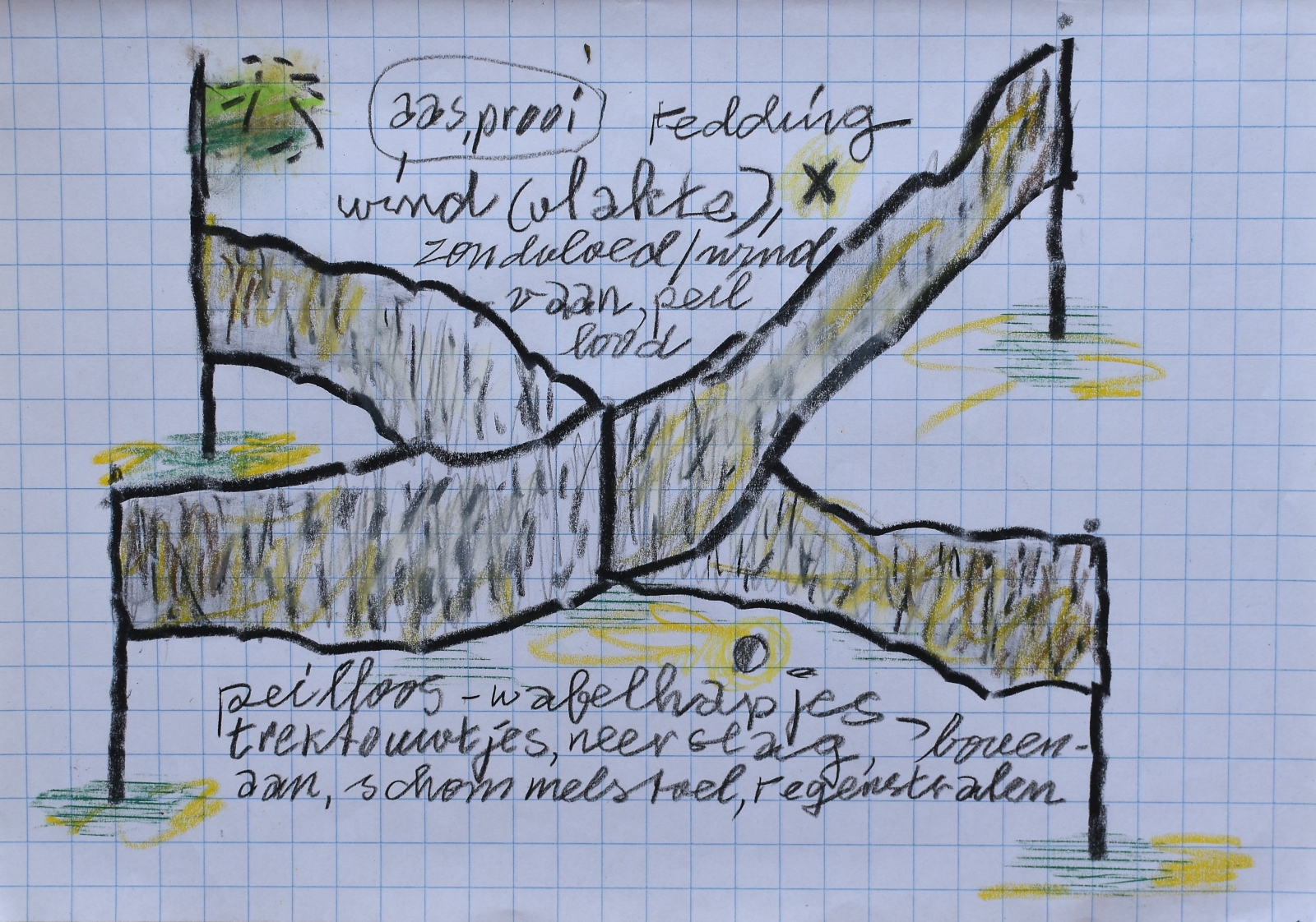 Krijttekening op hokjespapier.