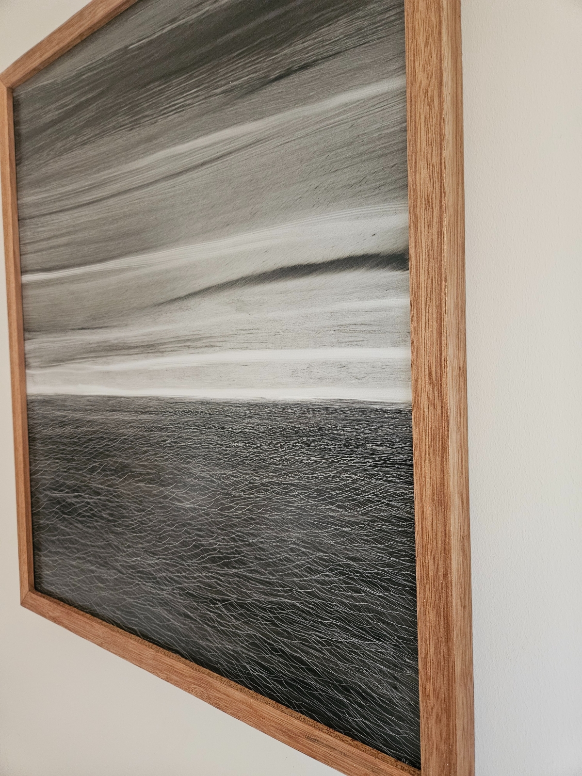 Japanese Sea continues my exploration of landscape through reduction and subtraction. The image is built by removing paint from a darkened surface, allowing light to emerge gradually through fine incisions. Tonal value, rather than colour, structures the composition: the horizon, the bands of sky, and the dense texture of the water are defined through subtle shifts in light and density. Up close, the sea is a field of intersecting lines; from a distance, it stabilises into a quiet, horizontal space.