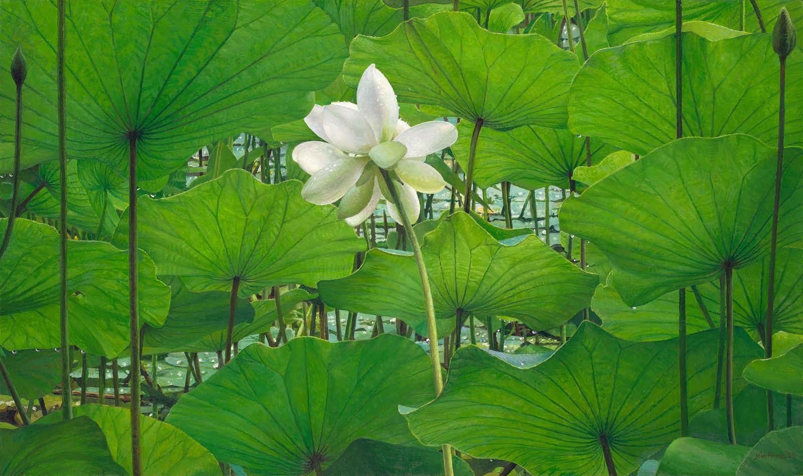 De eenzame witte lotus doet mij denken aan een danseres. Zij is het ongenaakbare witte middelpunt tussen de andere dansers.