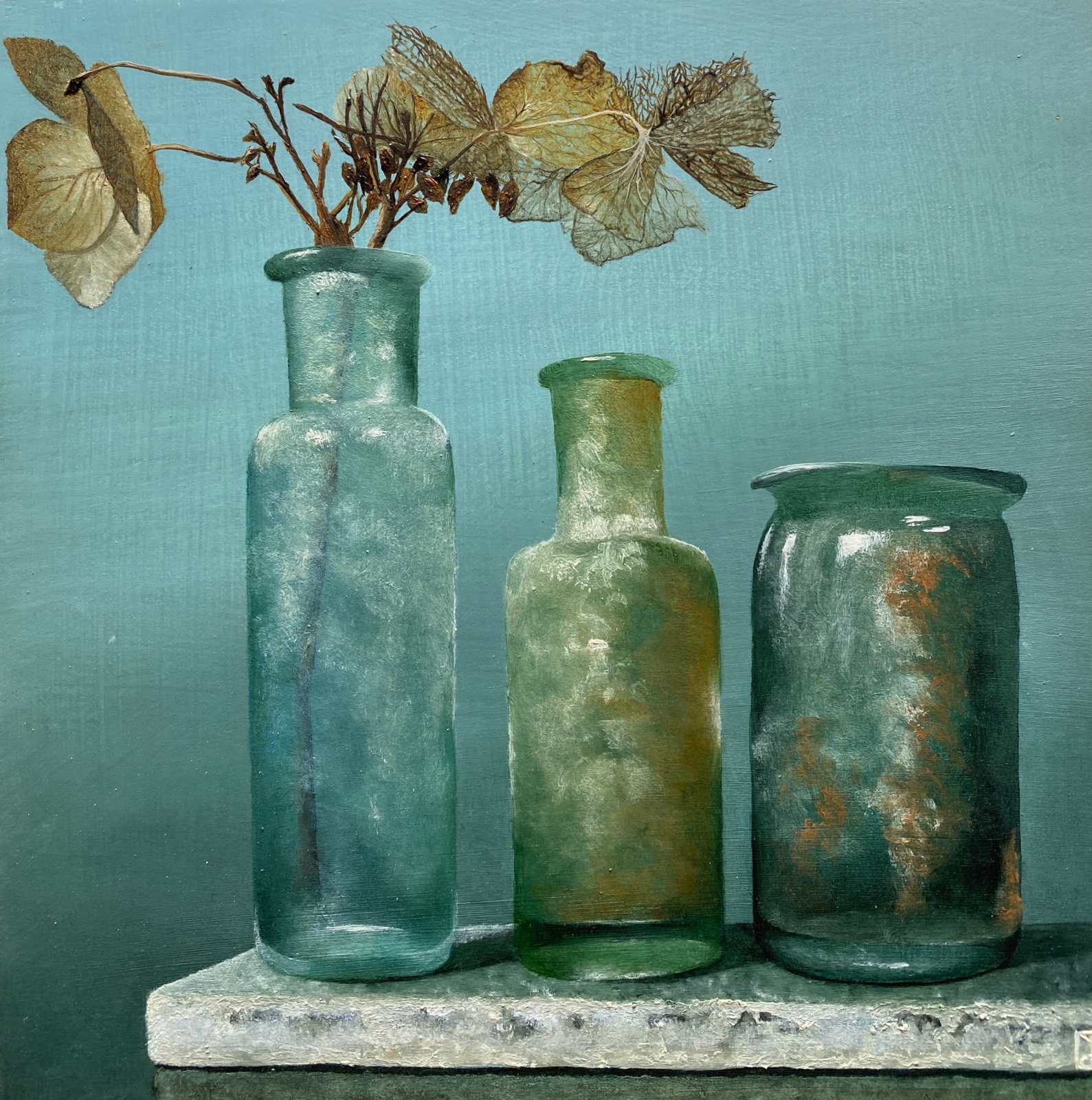 3 apothekersflesjes op bamboe paneel