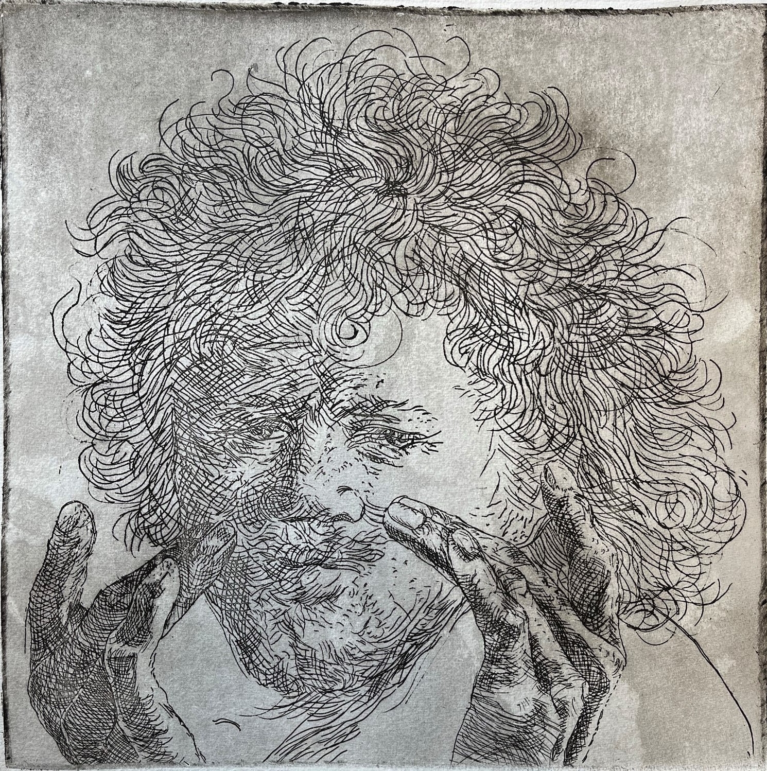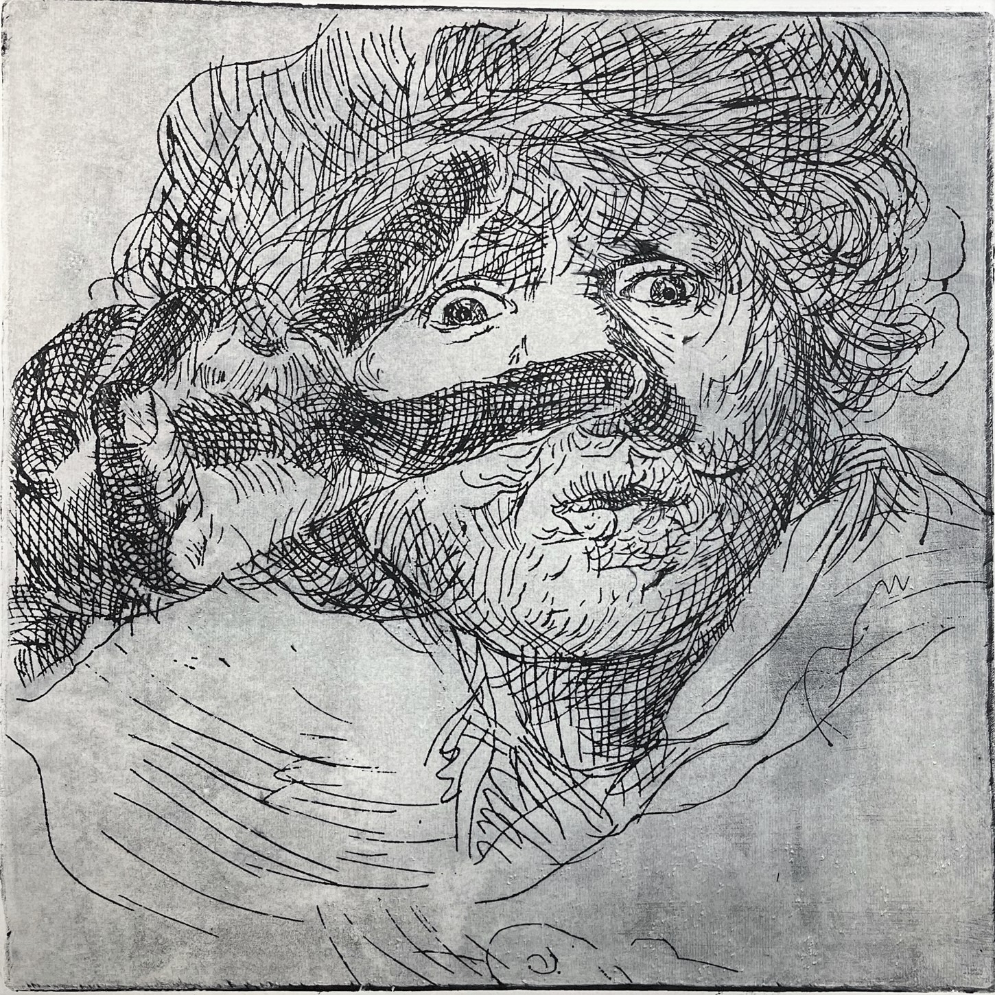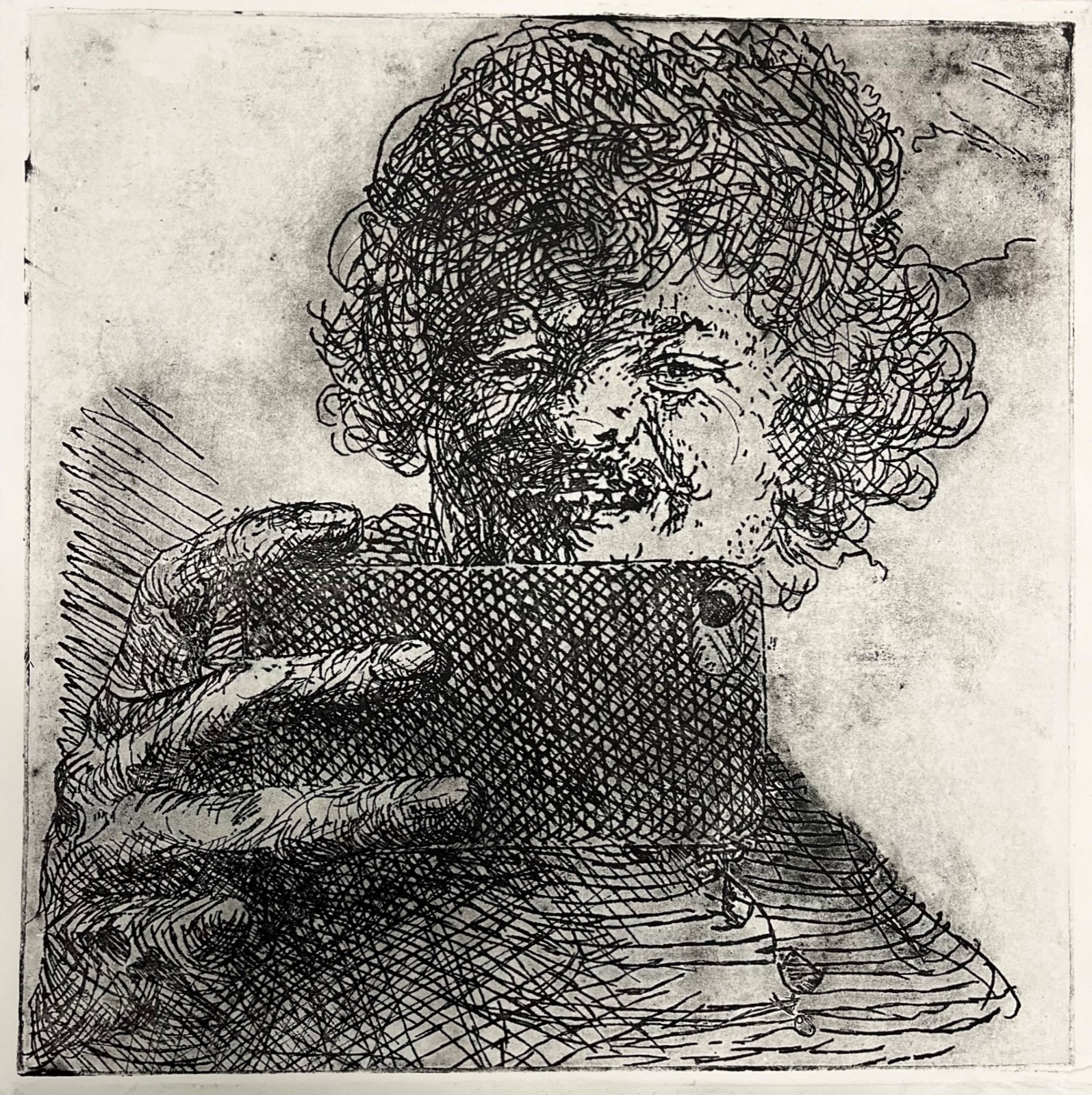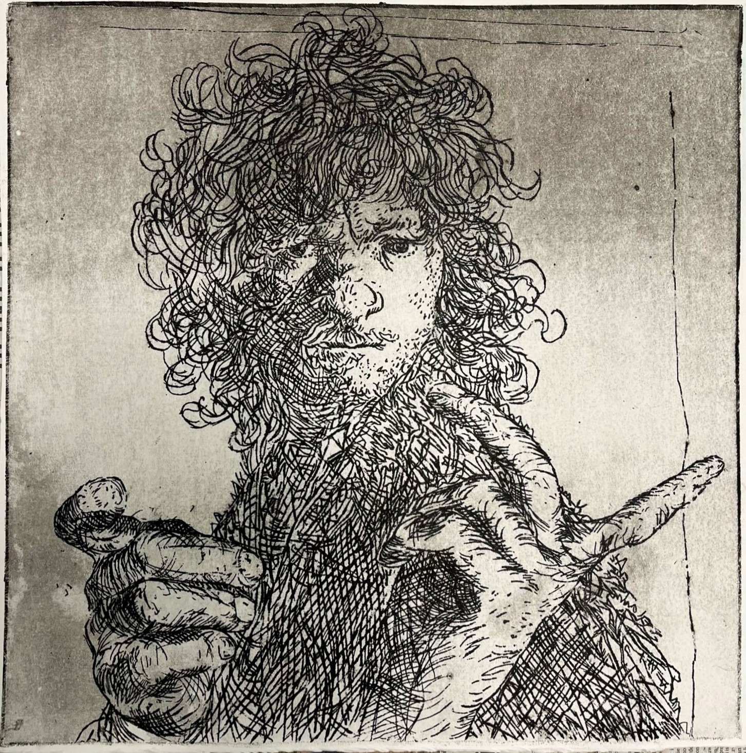 De etsen van Rembrandt hebben op mij als kunstenaar een bijzondere aantrekkingskracht. Ik heb deze etsen van Rembrandt drie jaar geleden als inspiratiebron gebruikt voor een eigen serie etsen, waarin ik commentaar lever op de huidige ‘selfie’-cultuur. In mijn serie heb ik de ‘selfies’ van Rembrandt gecombineerd met handgebaren, die bij de huidige selfie-cultuur gewoon zijn.