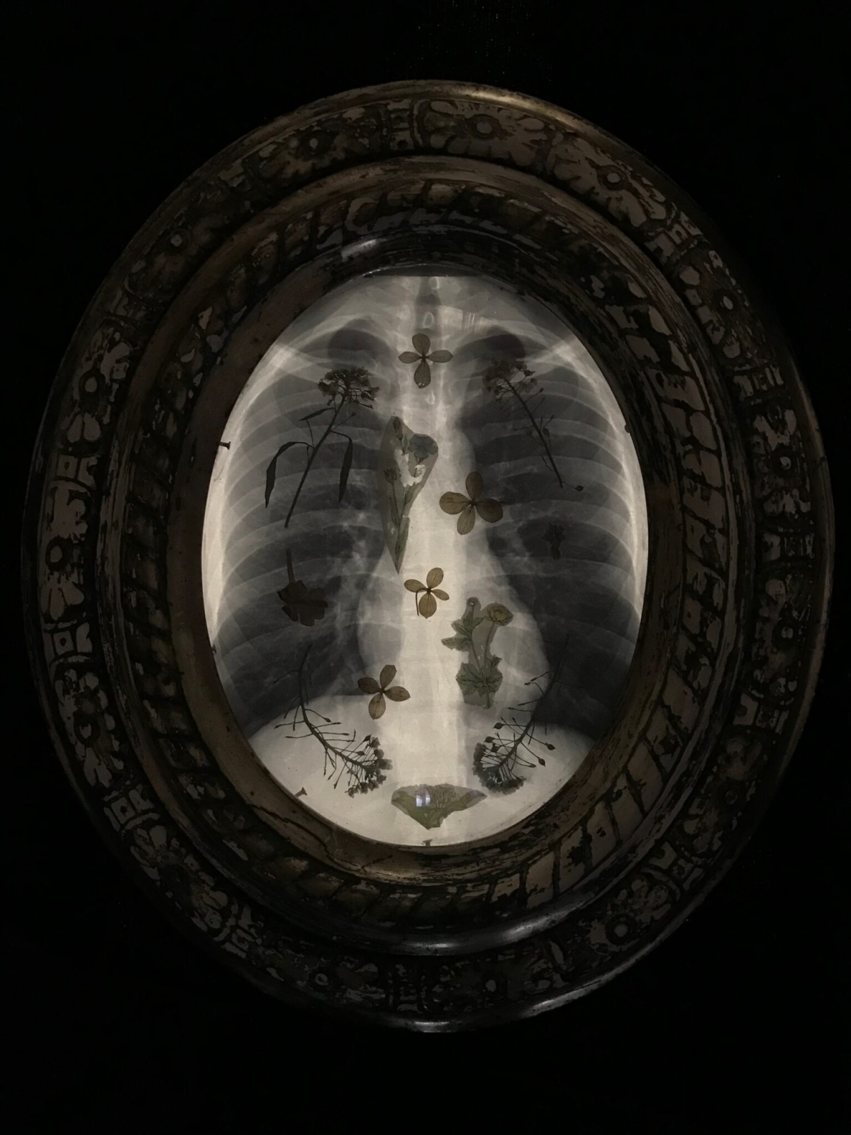 Light object with radiograph, dried flowers, water transferred etchings, in antique frame with convex glass and leather casing