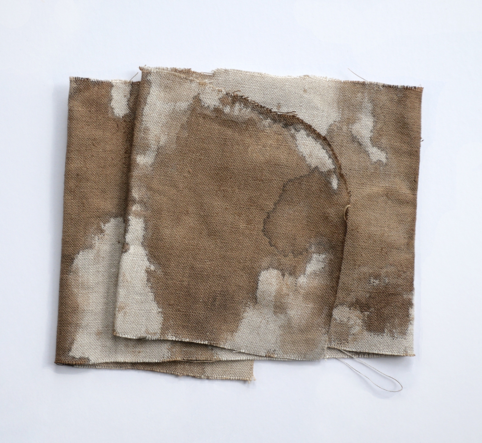 Dit sculpturale werkje maakt deel uit van een serie walnoteninkt werkjes op restjes schilderslinnen, gekregen van collega's. Het doek is gevouwen langs aanwezige vouwlijnen en gedept in walnoteninkt. Het is ingelijst in een diepe lijst met transparant-witte rand en voorzien van museumglas.