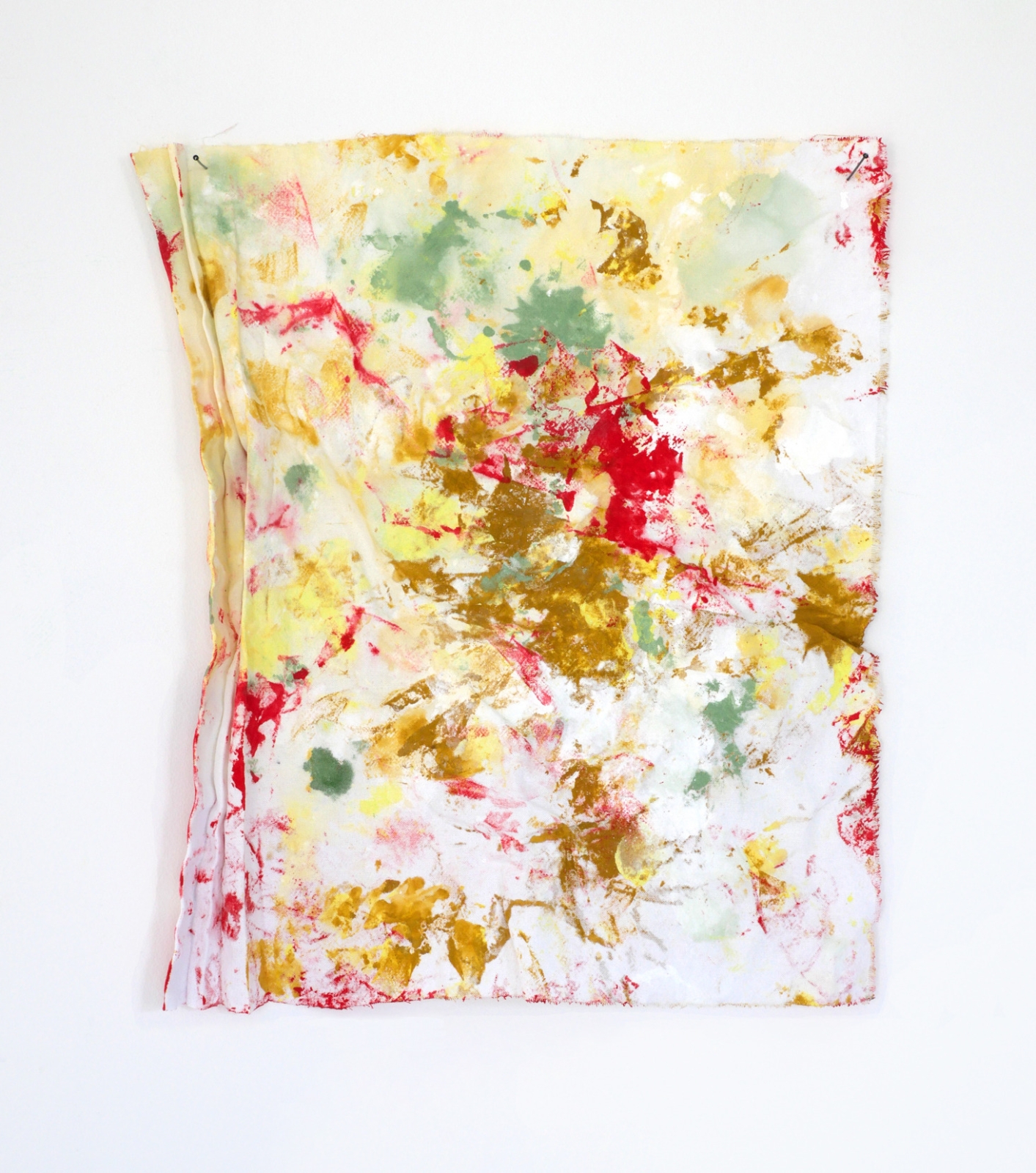 Maar dit is een toeval van een heel ander niveau. In 2024 zag ik, net voordat ik ze in de prullenbak gooide, dat twee van mijn poetsdoekjes – gescheurde oude lakens die ik gebruik om mijn penselen af te vegen – in 'ware' beelden waren veranderd. Sindsdien bewaar ik regelmatig gebruikte penselendoekjes. Ze voldoen helemaal aan mijn favoriete, enigszins simpele definitie van een schilderij: "Verf op doek". De vouwen en kreukels geven het werk een sculpturaal karakter. Dit werk is gemonteerd en gesigneerd op een witte houten achterplaat en voorzien van een acrylaat beschermkap.