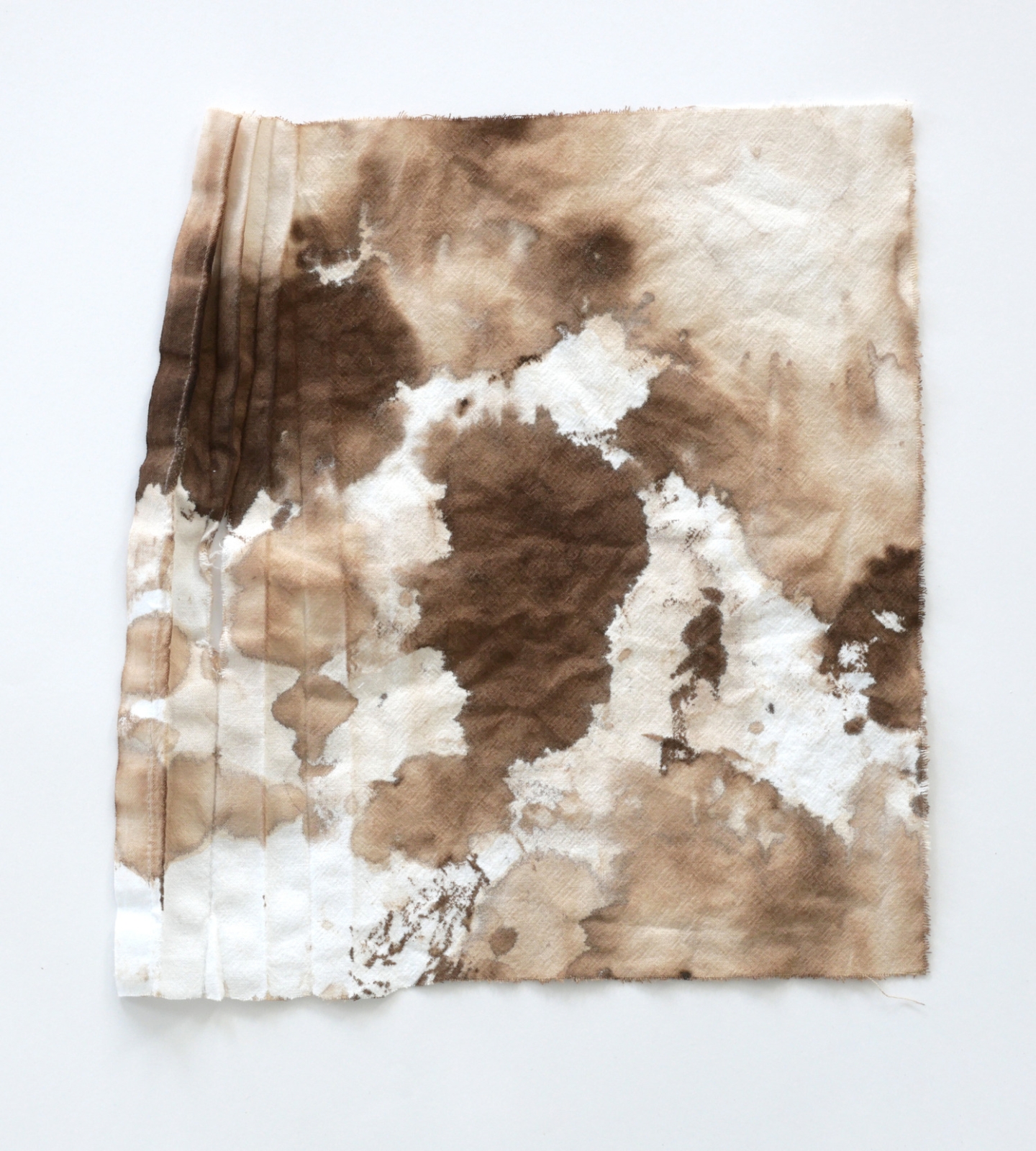 Maar dit is een toeval van een heel ander niveau. In 2024 zag ik, net voordat ik ze in de prullenbak gooide, dat twee van mijn poetsdoekjes – gescheurde oude lakens die ik gebruik om mijn penselen af te vegen – in 'ware' beelden waren veranderd. Sindsdien bewaar ik regelmatig gebruikte penselendoekjes. Ze voldoen helemaal aan mijn favoriete, enigszins simpele definitie van een schilderij: "Verf op doek". De vouwen en kreukels geven het werk een sculpturaal karakter. In dit geval gaat het om een penselendoekje met vlekken van walnoteninkt. Het werk is gemonteerd en gesigneerd op een witte houten achterplaat en voorzien van een acrylaat beschermkap.